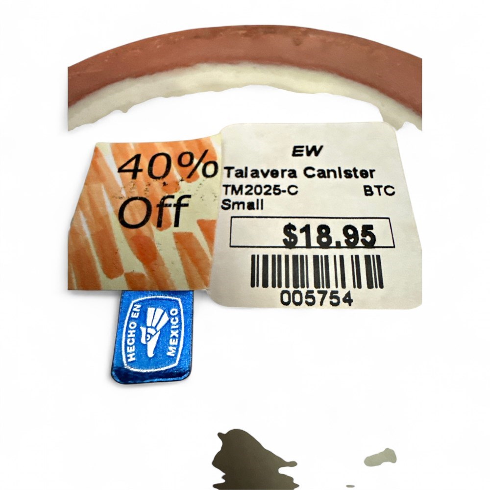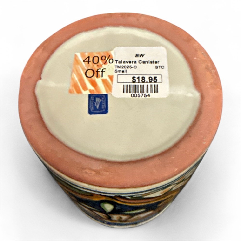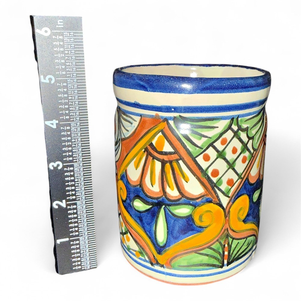 This handcrafted Talavera ceramic pot features a traditional tin-glazed earthenware body with a creamy white base and a vibrant, hand-painted multicolor design rendered in classic mineral pigments of cobalt blue, yellow, green, orange, black, and mauve. The intricate floral and geometric motifs reflect the historic blend of Spanish, Italian, Chinese, and indigenous Mexican artistic influences characteristic of authentic Talavera pottery, while the glossy glaze and slightly raised painted detailing result from a second high-temperature firing. It is marked model TM-2025C. Measuring approximately 5 3/8 inches high and presented in good condition.
