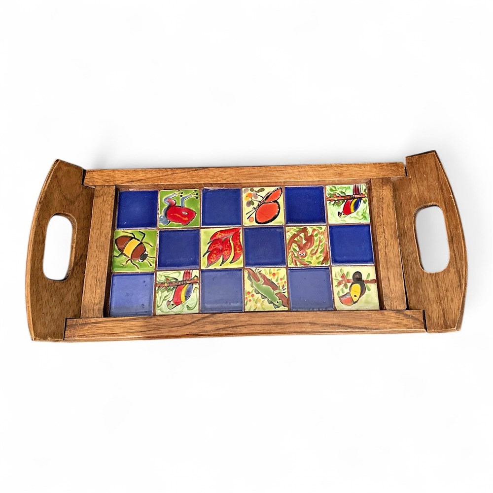 This vintage-style serving tray features a rustic carved wooden frame in a warm light-brown tone, complete with integrated handle cut-outs at each end. The center is inset with a grid of square ceramic tiles, each finished in a vivid cobalt-blue ground and decorated with colorful hand-painted illustrations of animals and insects, including a toucan, lizard, crab, frog, and beetle. The lively imagery and bold palette evoke the character of Mexican folk art or Portuguese decorative tilework commonly seen in pieces from the 1970s. Measuring approximately 20 inches in length, the tray shows light surface wear and a natural patina to the wood consistent with age, while remaining in overall good vintage condition.