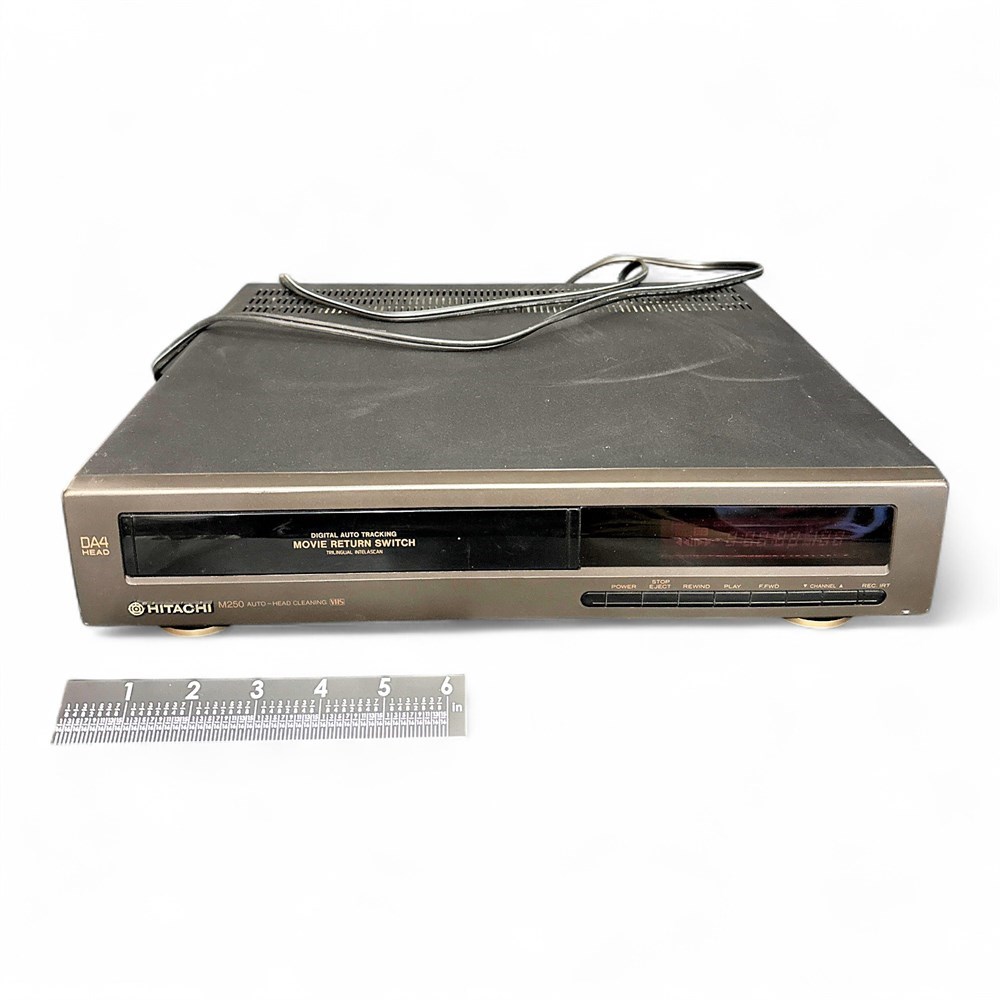 The Hitachi VT-M250A is a vintage VHS video cassette recorder designed for both playback and recording of standard VHS tapes. Manufactured by Hitachi, this compact unit features a DA4 head system along with convenient functions such as digital auto tracking for improved picture stability, automatic head cleaning for consistent performance, and a dedicated movie return switch for quick tape rewinding to the beginning. The front panel includes integrated control buttons and display window. Measuring approximately 12.5 inches long, 14.5 inches wide, and 3.5 inches high, the recorder remains in good overall condition with typical light cosmetic wear consistent with age.