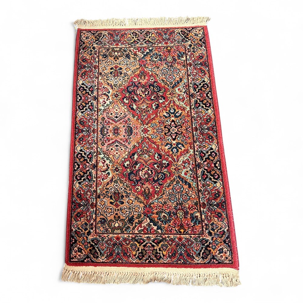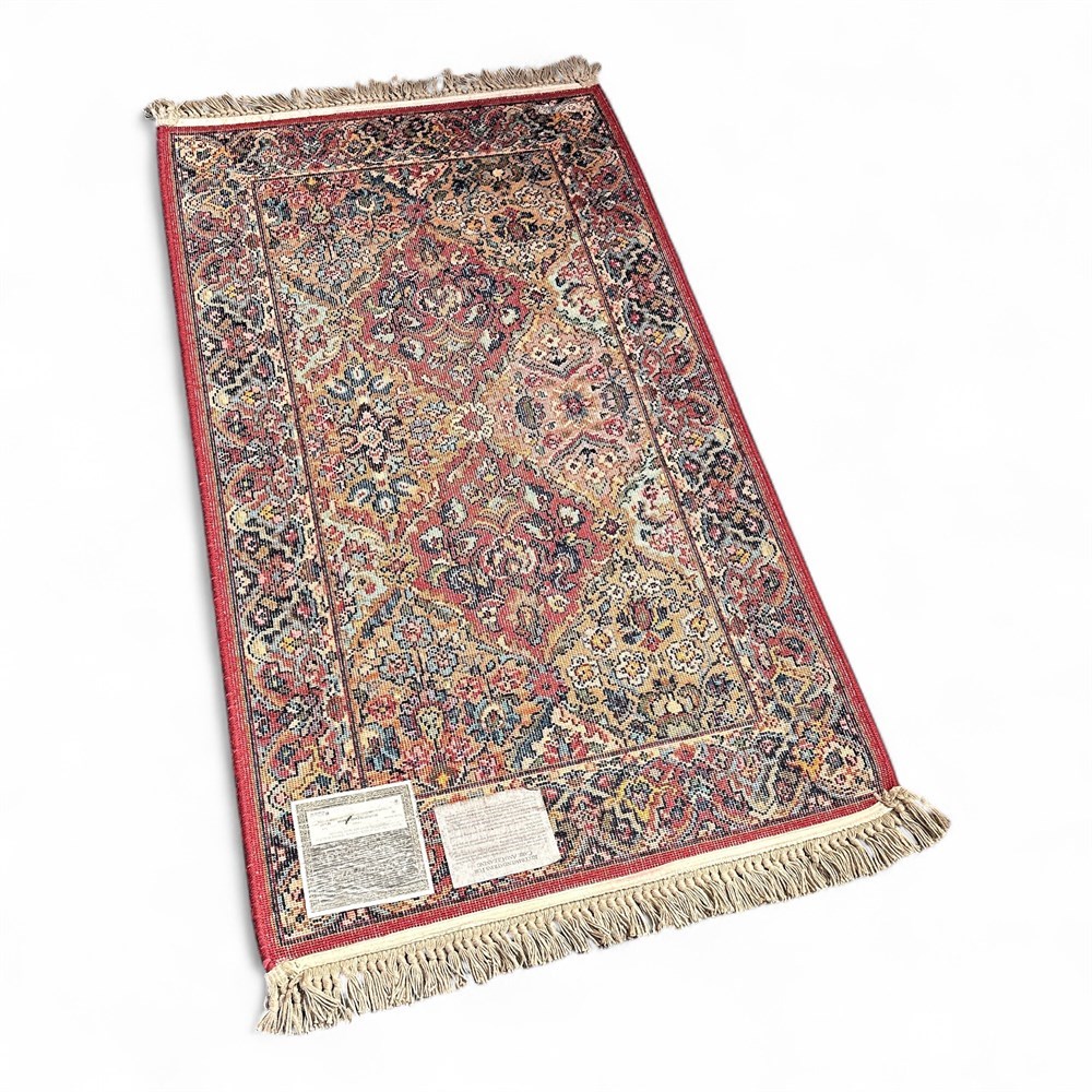 This vintage Karastan Multicolor Panel Kirman rug, design #717 from the renowned Original 700 Series, is a distinguished American-made textile celebrated for combining exceptional durability with the refined appearance of a traditional hand-knotted Persian carpet. Power-loomed in the United States using Karastan’s precise Axminster weaving technique, the rug is crafted from 100% premium fully worsted New Zealand wool pile. The design reflects the classic Persian Panel Kirman style first introduced by Karastan in 1937, featuring richly detailed floral motifs, branching foliage, and ornamental elements arranged within distinct multicolored panels and framed by an intricate border. Its vibrant palette is anchored by deep red tones and complemented by nuanced shades of blue, teal, light yellow, green, ivory, and numerous subtle accent colors. Measuring approximately 29.5 inches long by 52 inches wide and presented in good overall condition.