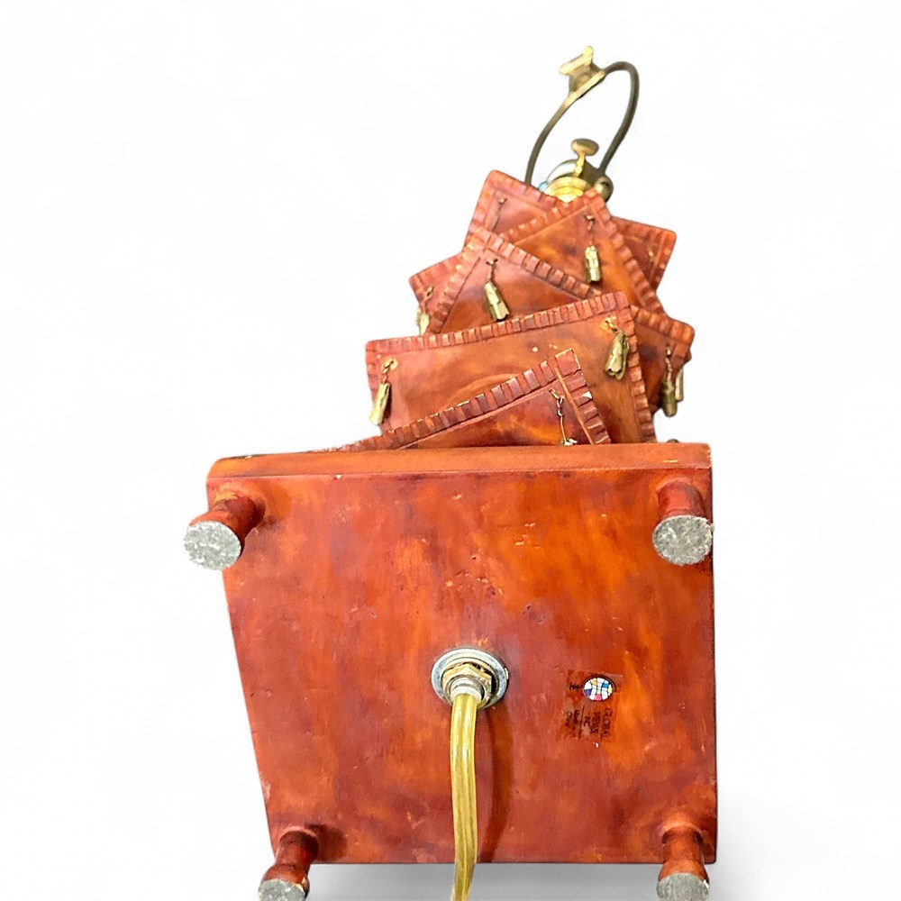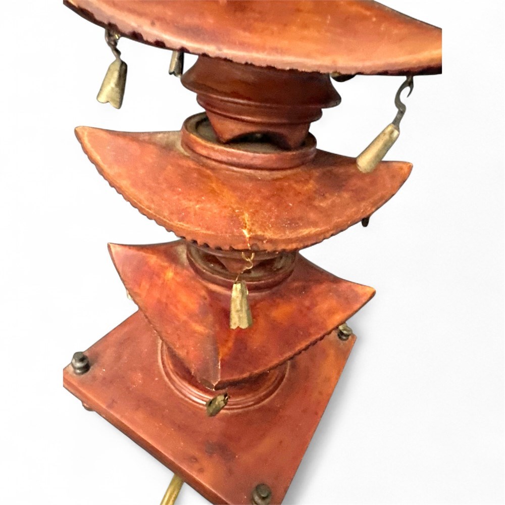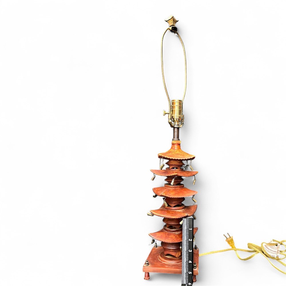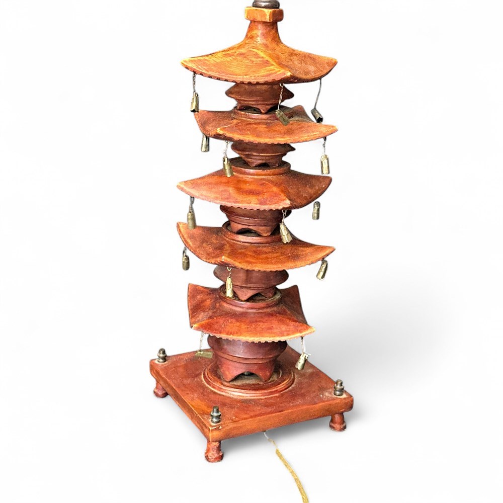 Vintage five-tier wooden pagoda-style table lamp by Global Views Inc., identified by the manufacturer’s label on the underside. The lamp features a finely crafted wood body finished in a warm reddish-brown tone and constructed in the form of a traditional East Asian pagoda with five stacked architectural tiers, each displaying gently curved, overhanging rooflines accented by small suspended decorative bells. The structure rises from a square wooden base with short feet and is fitted with brass-tone hardware, harp support, and finial for a standard shade (shade not included). Overall height measures approximately 28 inches to the top of the shade support, with a base footprint of approximately 5 1/2 by 5 1/2 inches. Presented in good vintage condition with typical light wear consistent with age and use.