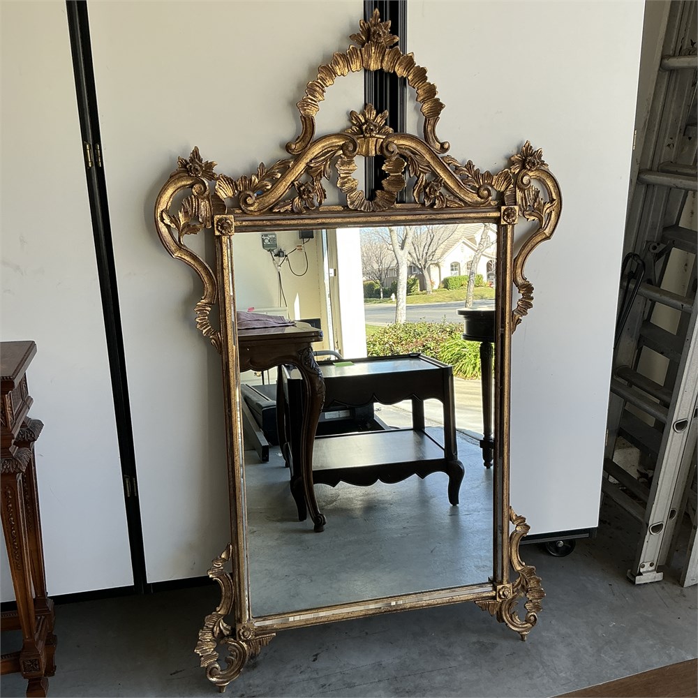 Vintage La Barge–style wall mirror featuring a highly ornate Rococo-inspired carved wood frame with pronounced scrolling acanthus leaves, floral elements, and shell motifs throughout. The substantial frame is finished in an antique gilt tone, emphasizing depth and relief in the carving. Constructed of carved wood and fitted with beveled mirror glass. Marked Made in Italy. Consistent with mid-to-late 20th century production associated with La Barge imports. Overall measurements: approximately 36 inches wide by 58 inches high. Condition: Good vintage condition with typical surface wear, minor finish loss, and age-appropriate imperfections to frame and finish. Mirror glass remains intact.