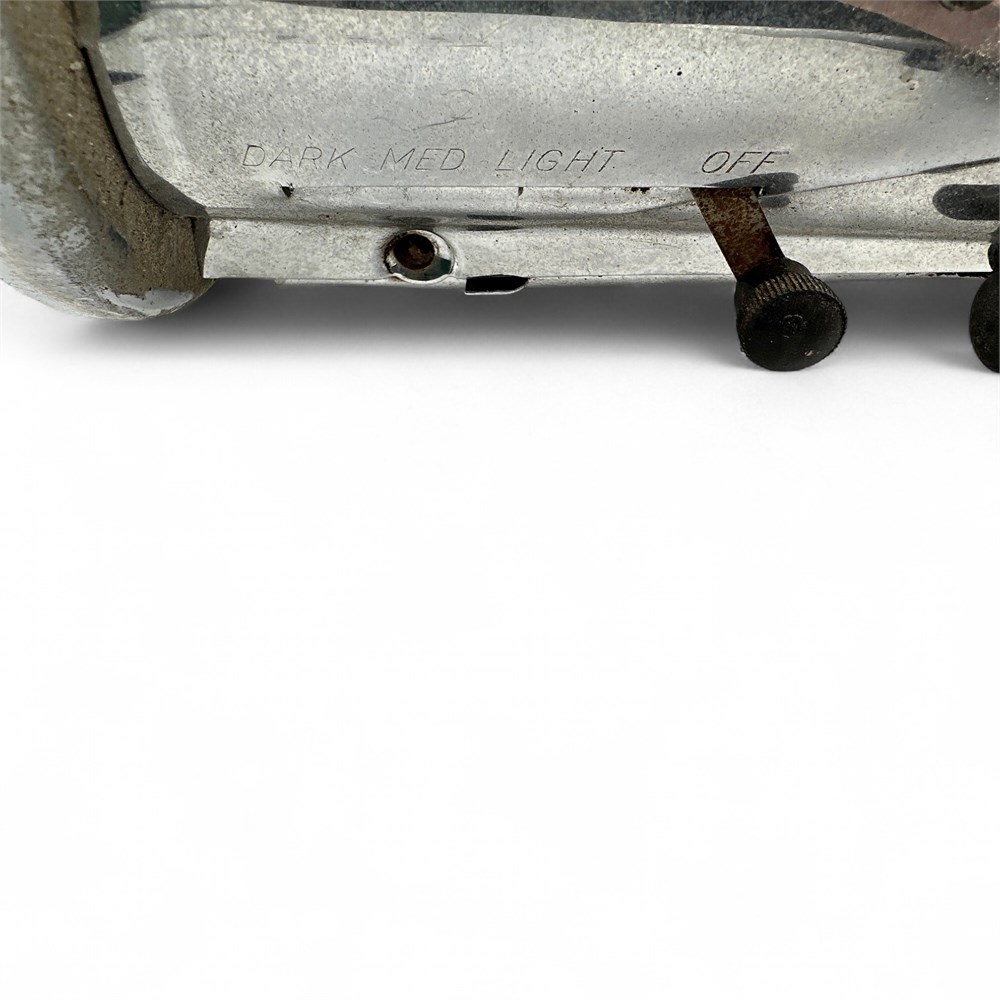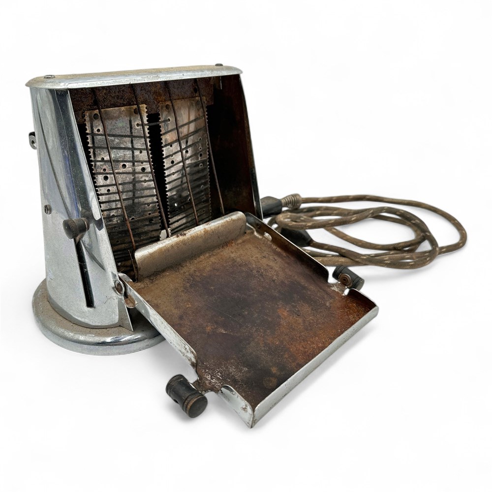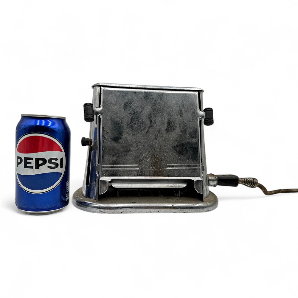 A vintage electric "butterfly" or "flip side" toaster, from the 1930s or 1940s. The toaster features an Art Deco design aesthetic, common for appliances of its time. It is constructed primarily of chrome-plated metal. It is a manual toaster; users would place a slice of bread on the internal rack and then flip the side door down to toast one side. The electrical cord often includes a simple on/off toggle switch to activate the heating elements. When the side panels are opened, the internal heating elements and wire rack are exposed. The mechanism allows the side doors to swing out from the center, resembling butterfly wings, which gives the toaster its common nickname. 7" H x 9" W x 5.5" L Good condition.