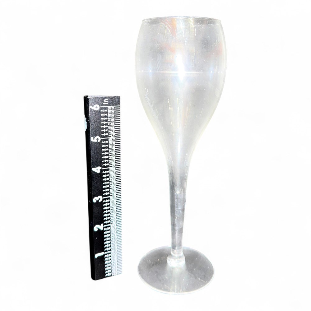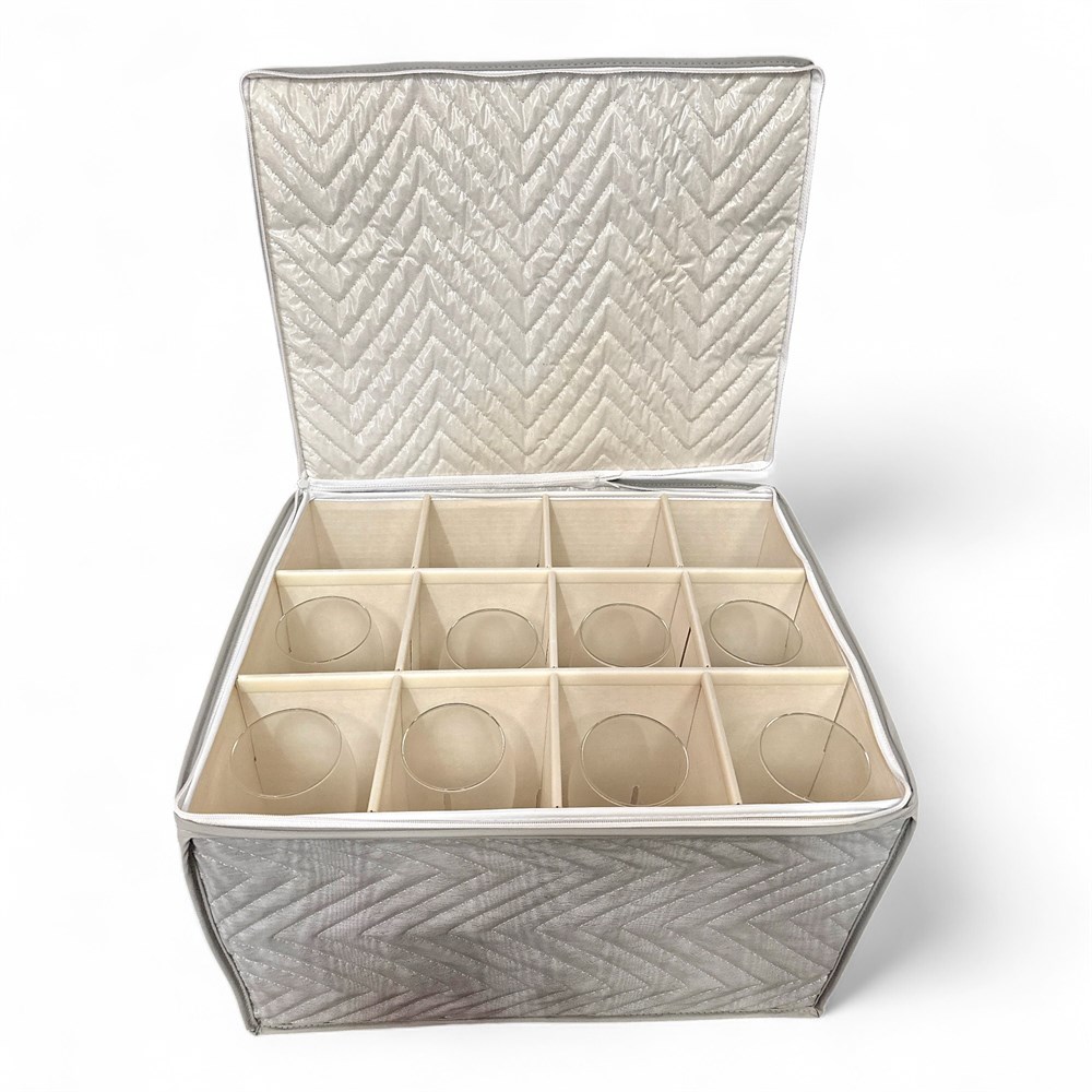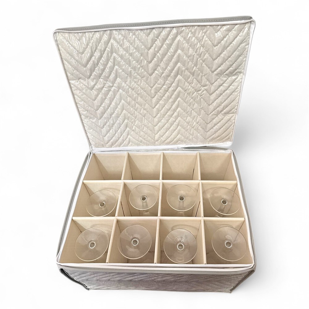 A set of eight tulip-shaped champagne flutes. This style of glassware is characterized by its tall, slender stem and a bowl that curves inward at the top, mimicking the shape of a tulip flower. Comes with quilted case. Glasses: 9" H; Carrying case: 12" L x 15" W Good condition.