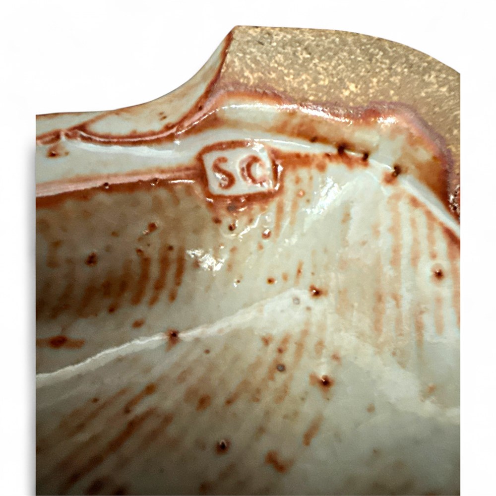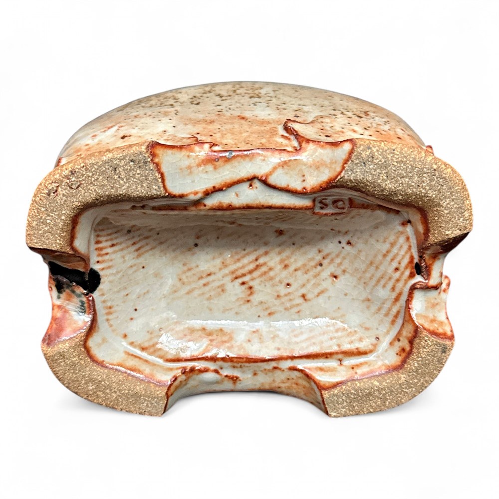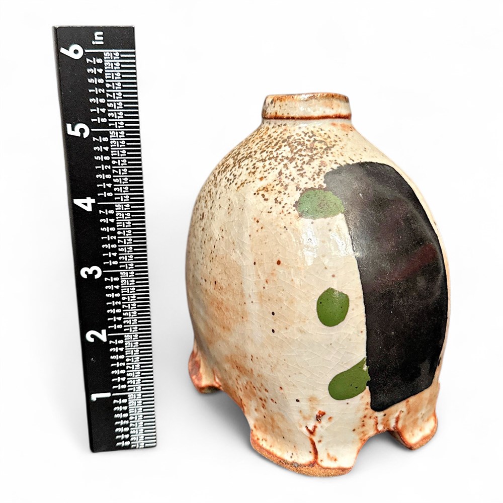 A unique, partially glazed stoneware vase, likely by a contemporary studio potter. The piece features an ash-glazed or similar light-colored exterior with a dark, glossy, speckled gray section. It has green circular and drop-shaped accents on the front. The raw, textured, and slightly irregular base is typical of anagama-fired or soda-fired ceramics. Signed "SC" at underside. 5 1/2" H Good condition.