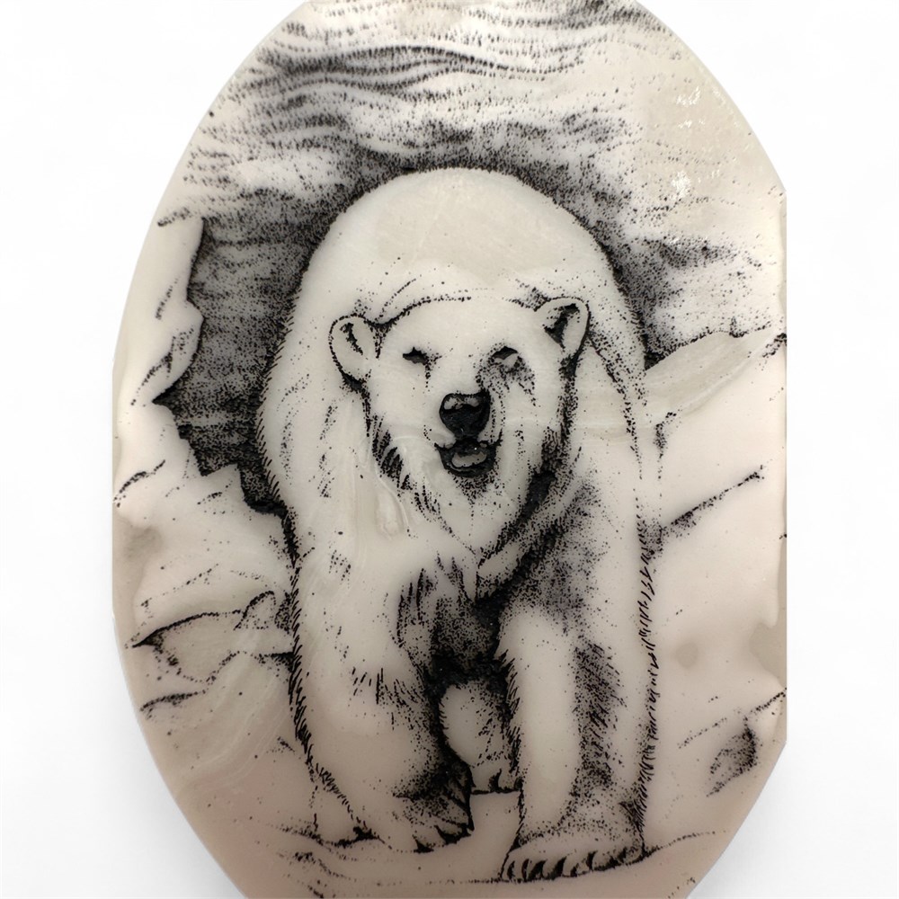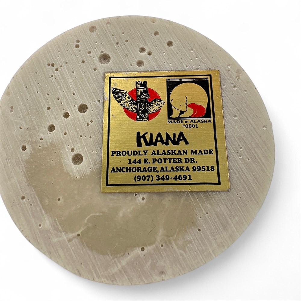 An etched marble polar bear paperweight or figurine, made by Kiana Alaska. The item features a detailed etching of a polar bear standing in an icy landscape. It is made from a light-colored, smooth stone, likely marble or a similar resin composite. Items like this are associated with Alaskan Native art or souvenirs, sometimes referred to as "scrimshaw" style. 3" H x 2.5" W Good condition.