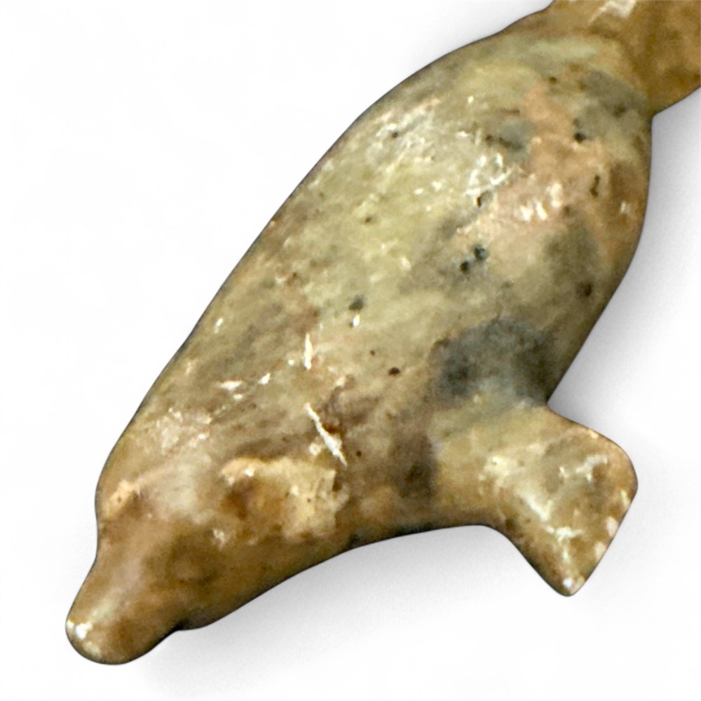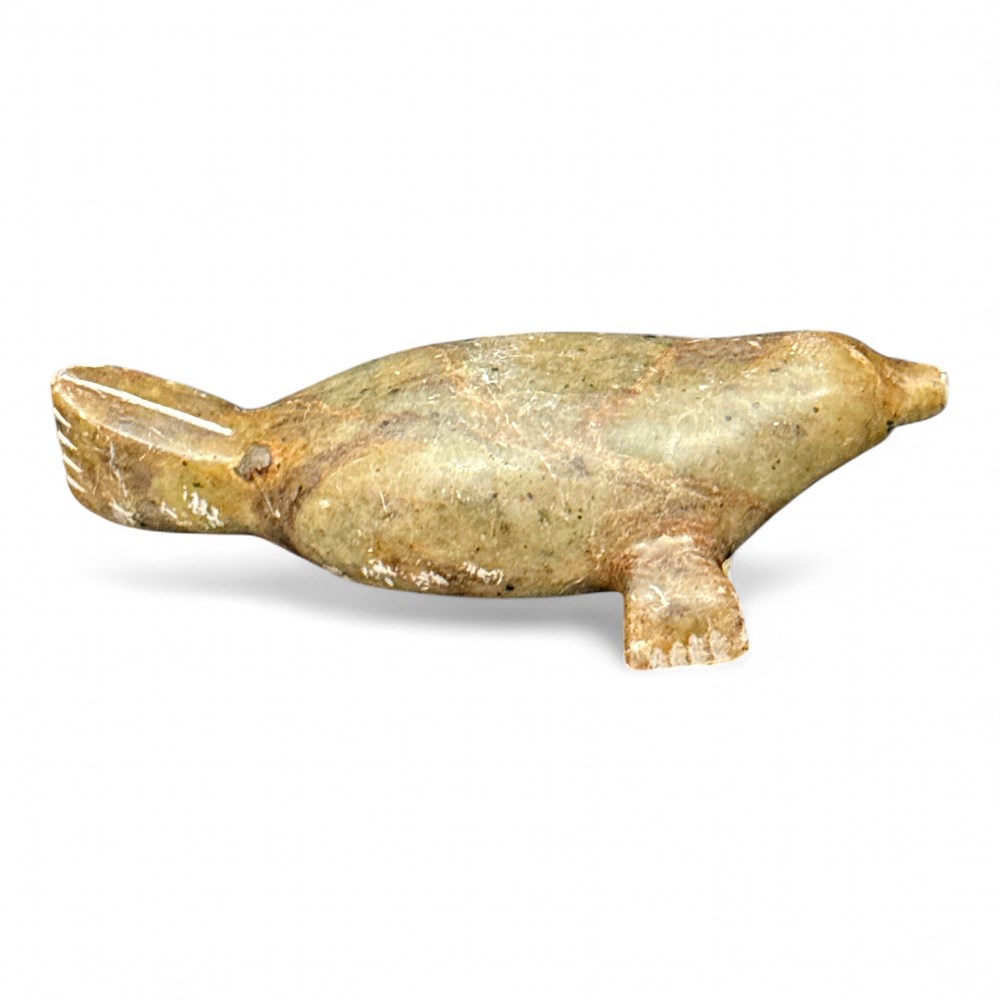 Inuit-style soapstone carving of a marine mammal, likely a seal, whale, or walrus. The carving is made from natural soapstone, which is a traditional material for Inuit art. It features a minimalist, stylized form characteristic of traditional Inuit craftsmanship. The piece reflects the cultural heritage and significance of marine life in Inuit culture. Underside has sticker reading "George M John". 4" L x 1" H Good condition.
