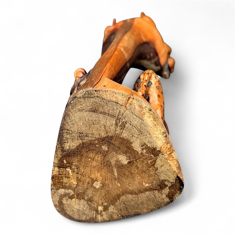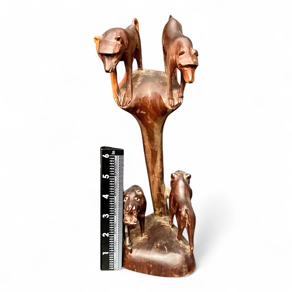 This sculpture is hand carved from a single piece of wood and features multiple animal figures emerging from a central vertical form. It depicts four animals resembling large cats, with two positioned at the top facing opposite directions and two figures at the base. It reflects a style associated with traditional African carving. Made in mid 20th century, this item measures 12 inches in height, and is in good condition.