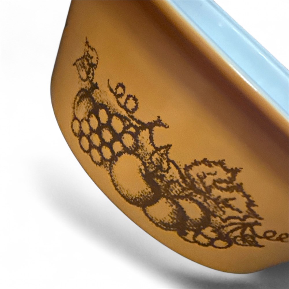 Vintage covered casserole dish in the “Old Orchard” pattern produced by Pyrex, dating to approximately 1973–1977. The round milk glass form features a gold-toned exterior decorated with brown orchard fruit motifs including apples, pears, cherries, grapes, and peaches, repeated around the body. The dish is fitted with the original clear glass lid and retains the manufacturer’s stamp on the base. Measures approximately 4 inches in height by 11 1/2 inches in diameter. Condition reported as good.