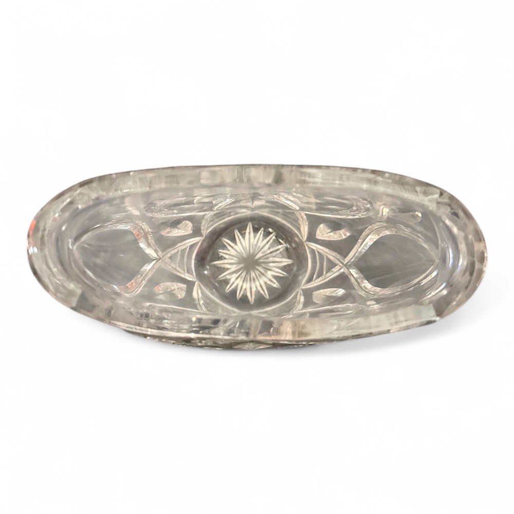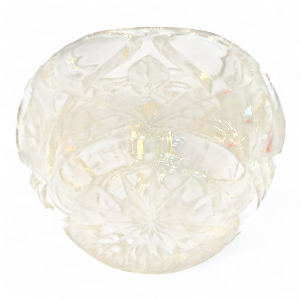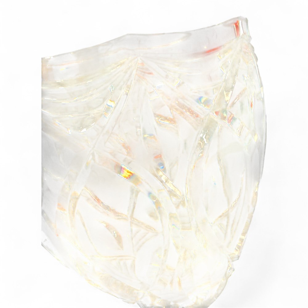 Clear cut crystal vase of curved, tapering form with a slightly flared and scalloped rim. The surface is fully decorated with an intricate repeating pattern composed of elongated oval or palm-leaf motifs intersected by diagonal cross-cuts forming diamond shapes, with additional detailed cutting throughout to enhance light refraction. Constructed of heavy crystal consistent with traditional cut glass techniques. Measures approximately 7 1/2 inches in height by 6 1/2 inches in width. Condition reported as good.