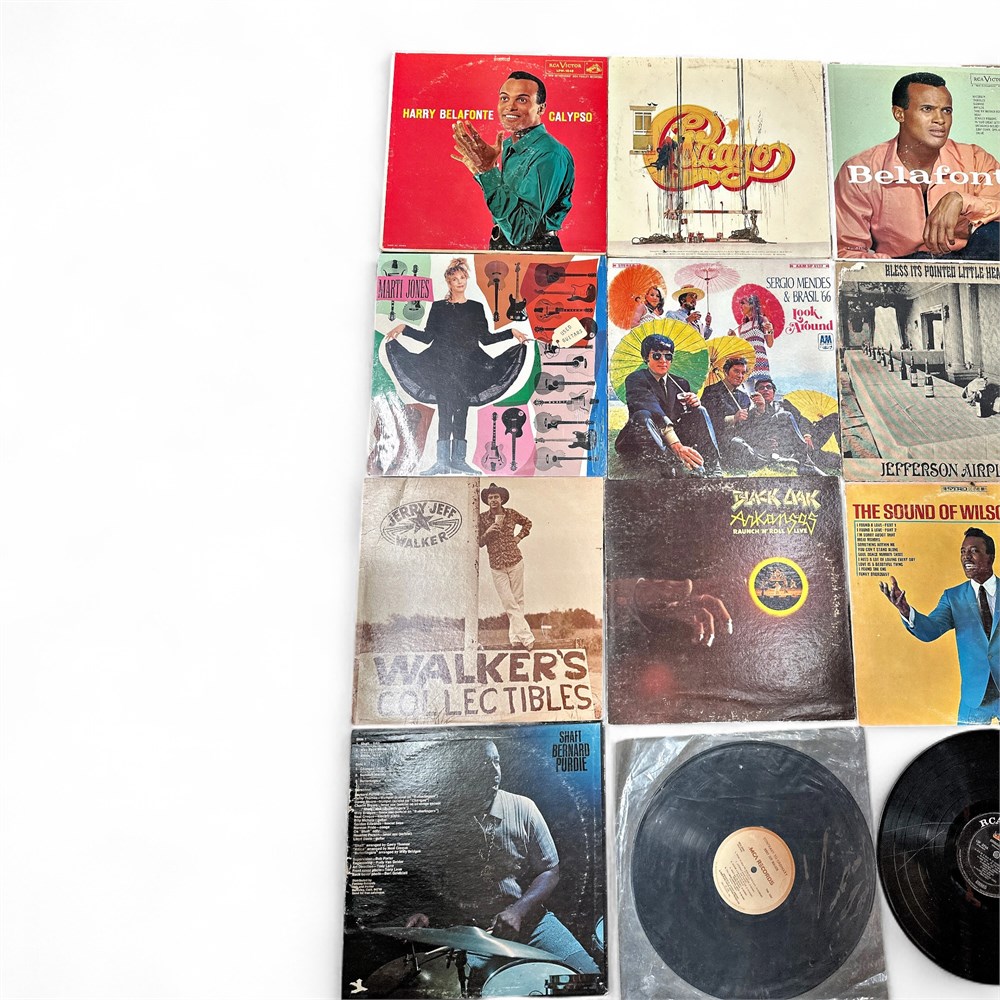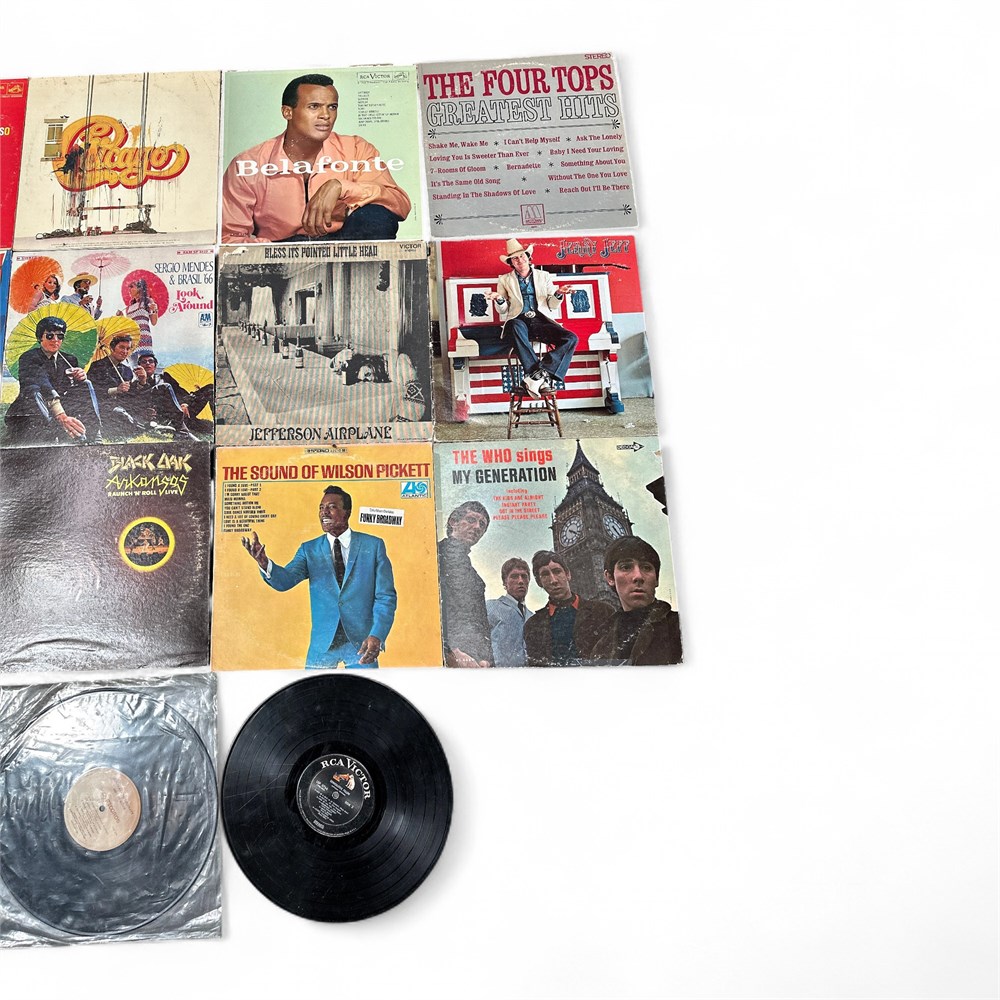 A collection of fifteen vintage vinyl records, including albums such as Harry Belafonte's Calypso, Jefferson Airplane's Bless Its Pointed Little Head, The Who's My Generation, and The Four Tops' Greatest Hits. Other artists in the collection include Jerry Jeff Walker, Marti Jones, Bernard Purdie, Wilson Pickett, and Sergio Mendes & Brasil '66. 12" L x 12" W Good condition Please note: two records do not have protective covers.
