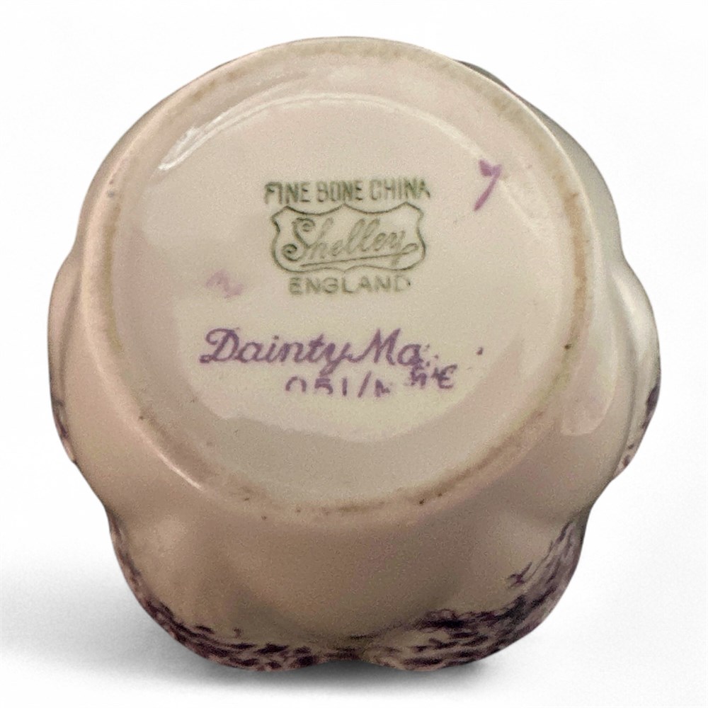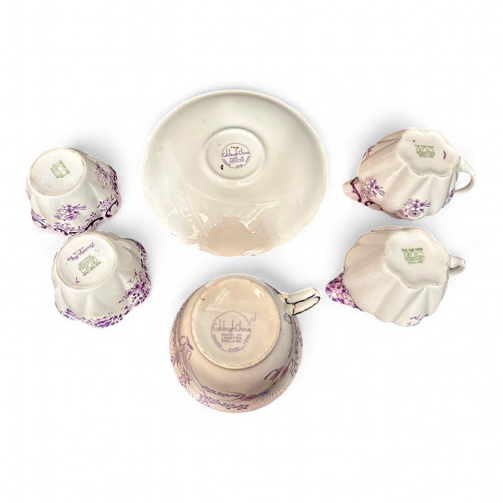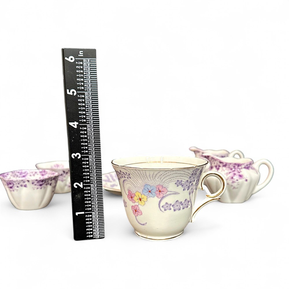Group of vintage tea items: two creamers and two sugar bowls by Shelley in the Dainty Mauve pattern, and a cup and saucer by Colclough China, who was founded in 1890 and received a royal license in 1913. Teacup: 2 3/4" H; Plate: 6" Dia Good condition.