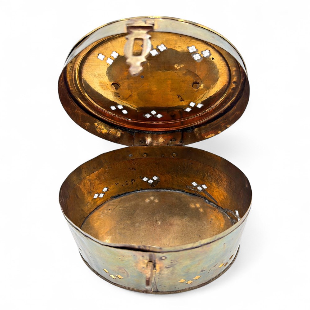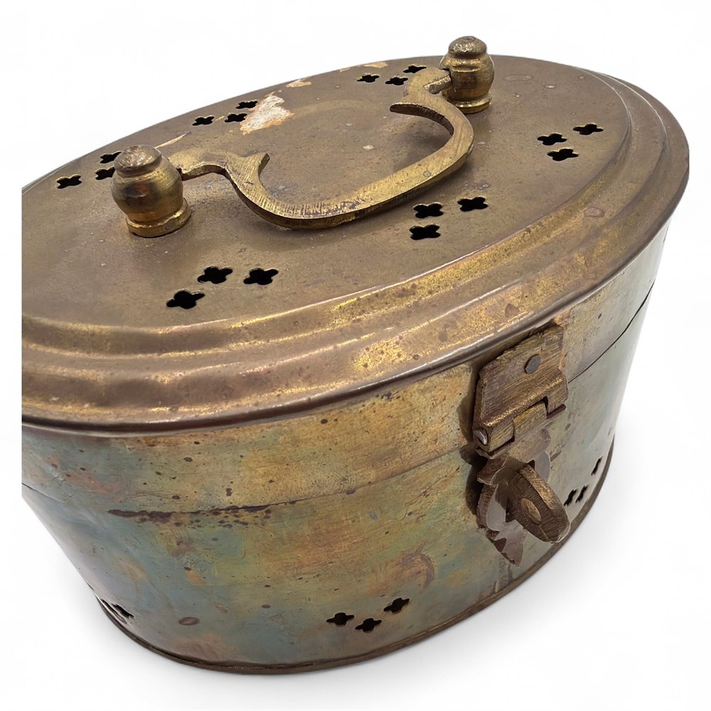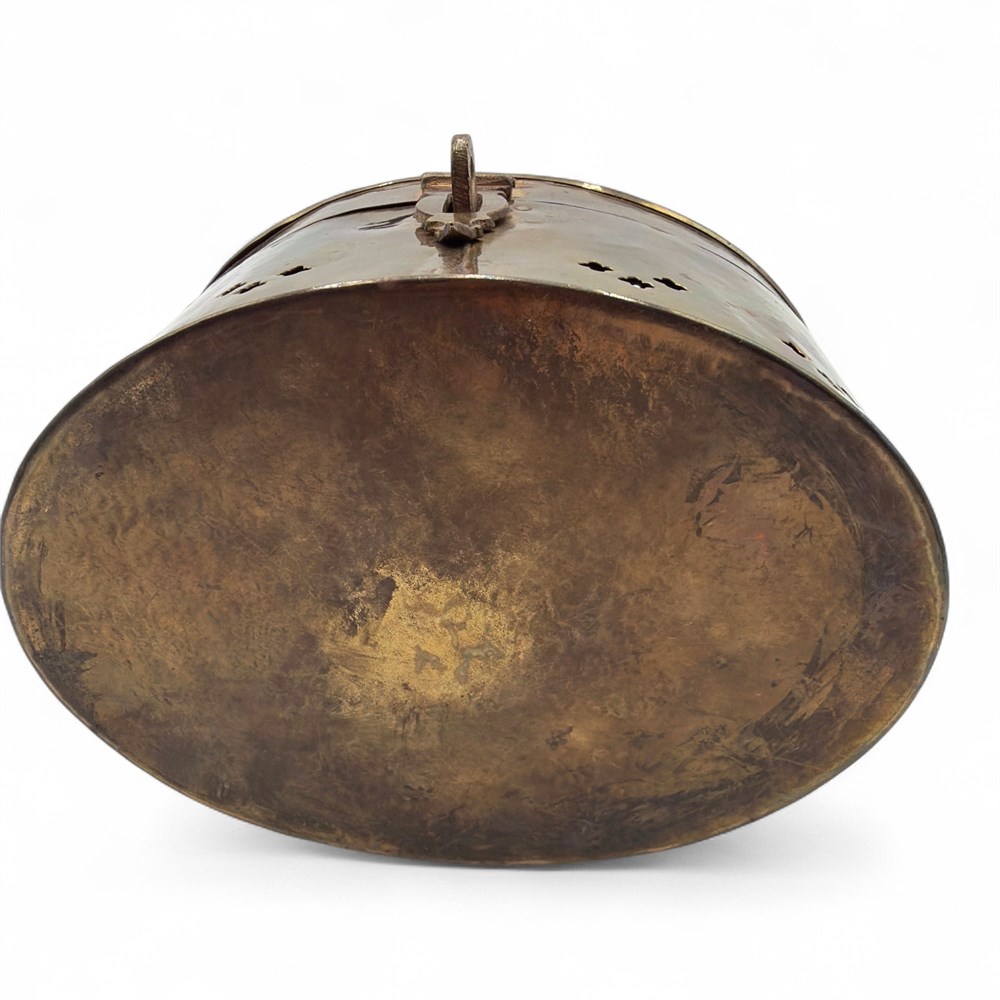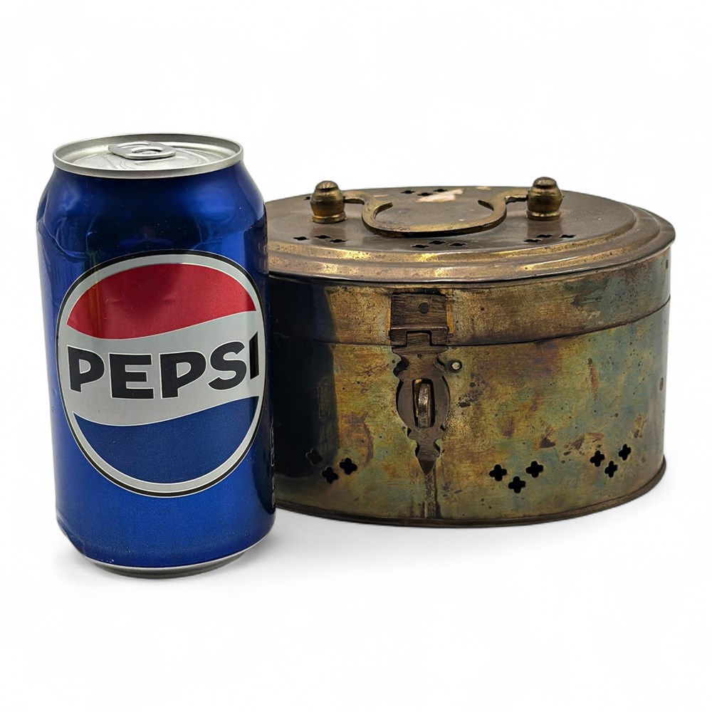 Oval-shaped box, made of solid brass and originates from India. It features a hinged lid with an attached top handle and a front latch closure that secures the lid. It includes small cross-shaped perforations along the lid and sides that allow air circulation. It measures 6 inches in length, 4 inches in width, and 3 inches in height, and is in good condition, retaining an aged surface patina consistent with vintage brass.