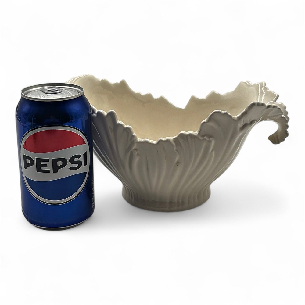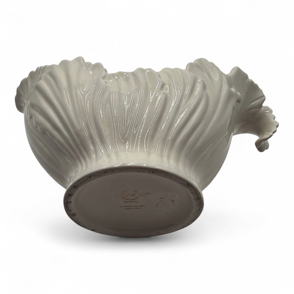 A Lenox 75th Anniversary Teleflora porcelain gravy boat or planter in an ivory color with an embossed cabbage leaf pattern. It was produced in 2009 for Teleflora's 75th anniversary. The piece is made of high-quality porcelain and features a handle on one end. It can be used as a functional gravy boat, a planter, or a decorative centerpiece. 9" L x 4 1/2" W x 1 1/2" H Good condition.