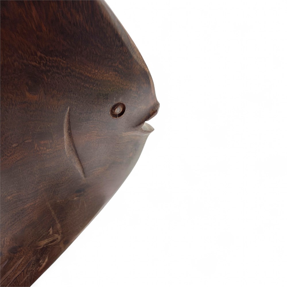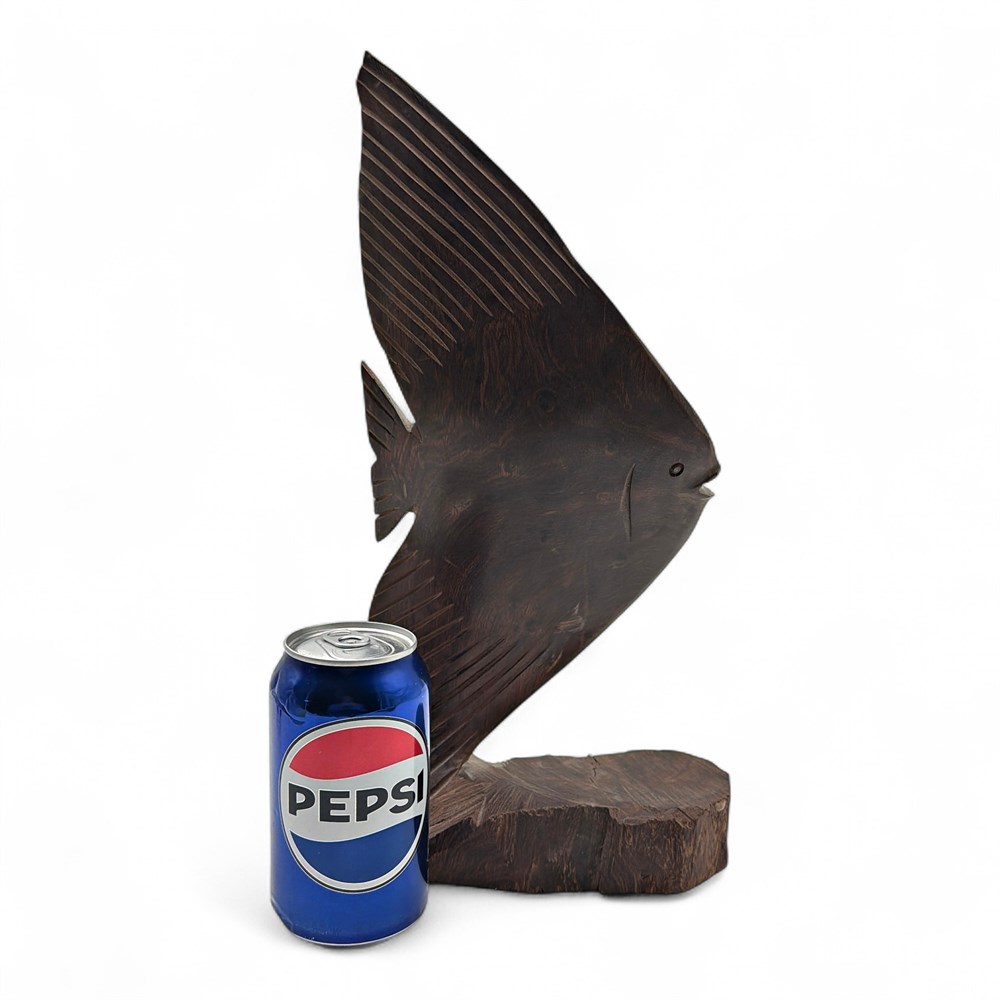 This sculpture is carved from ironwood and depicts a stylized tropical fish mounted on a natural wood base. It features a tapered body with elongated dorsal and anal fins carved with linear detailing and a smaller pointed tail fin. It includes carved details at the eye and mouth and shows visible natural wood grain throughout. Mid century style. It measures 7 inches in length and 13.5 inches in height. It is in good condition.