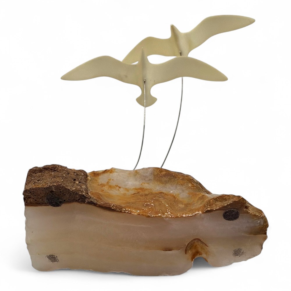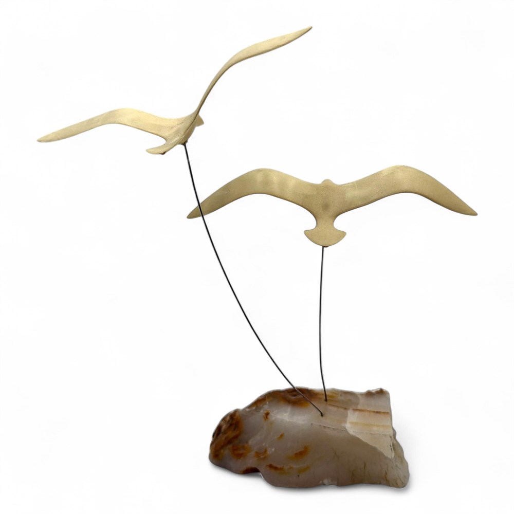 A vintage 1970s Marvin Wernick kinetic sculpture featuring two flying seagulls on a quartz base. The birds are made of a white composition resin, mounted on thin steel rods that allow them to move. The base is an irregularly shaped piece of natural quartz stone. This piece is considered Mid-Century Modern (MCM) art. 4" L x 8" H