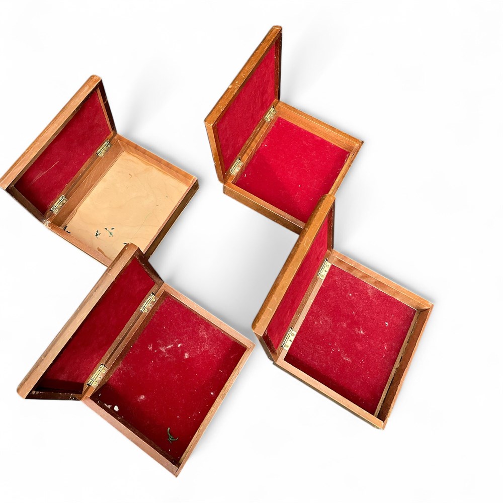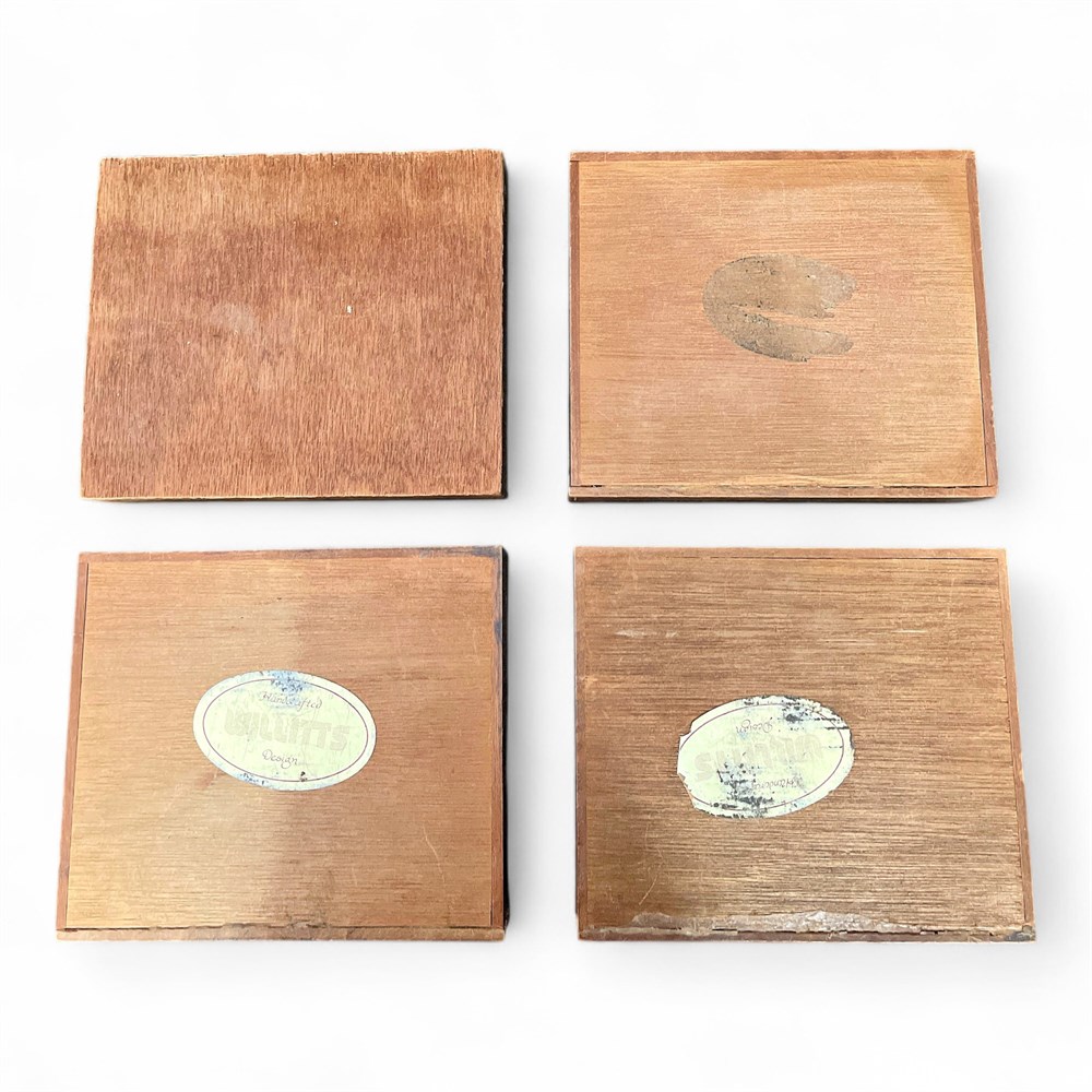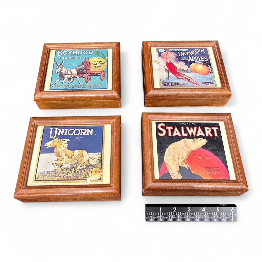 This set includes four wooden boxes made by Willitts Handcrafted Design, retaining the original tag on the bottom. They feature reproductions of vintage American fruit crate label artwork presented as full-color printed images on the lids. They depict “Boyhood Grapefruit,” “Diving Girl Apples,” “Unicorn Brand,” and “Stalwart Valencias,” representing historic produce advertising imagery from California. They measure approximately 6 inches in length and 7 inches in width each. The set is in good condition.