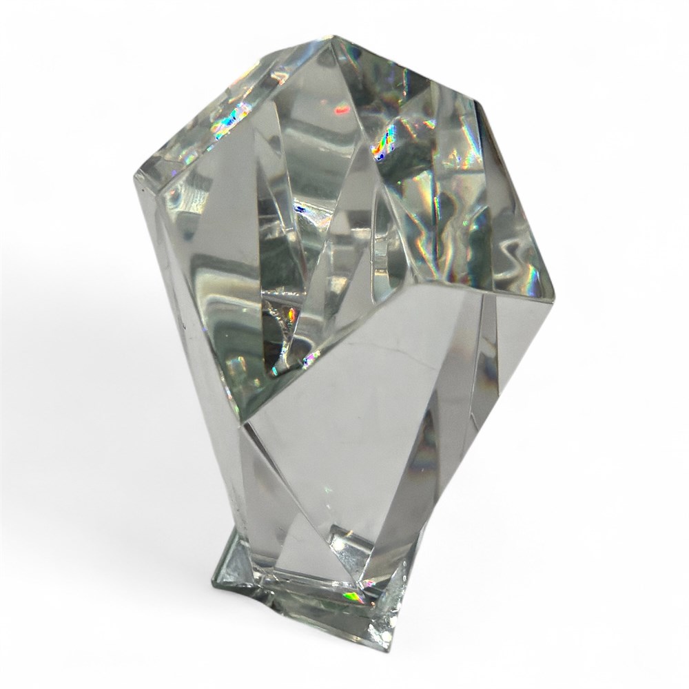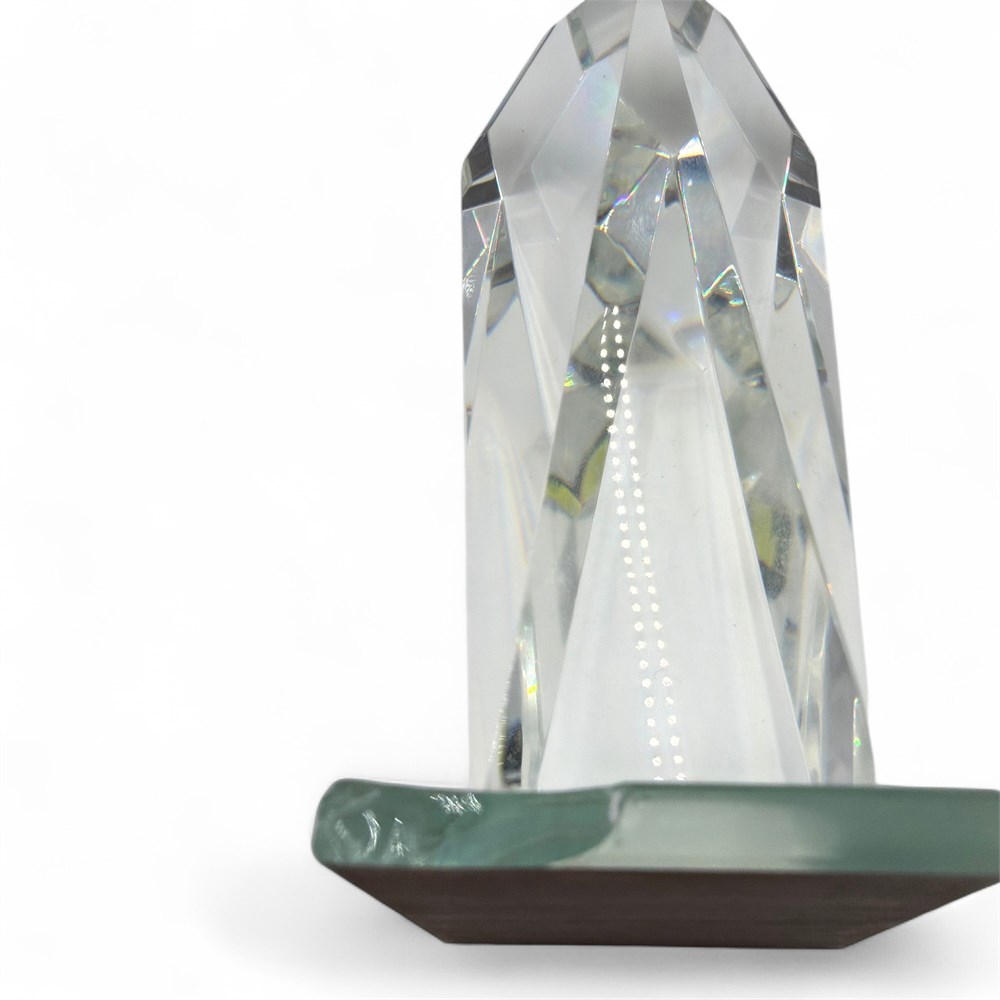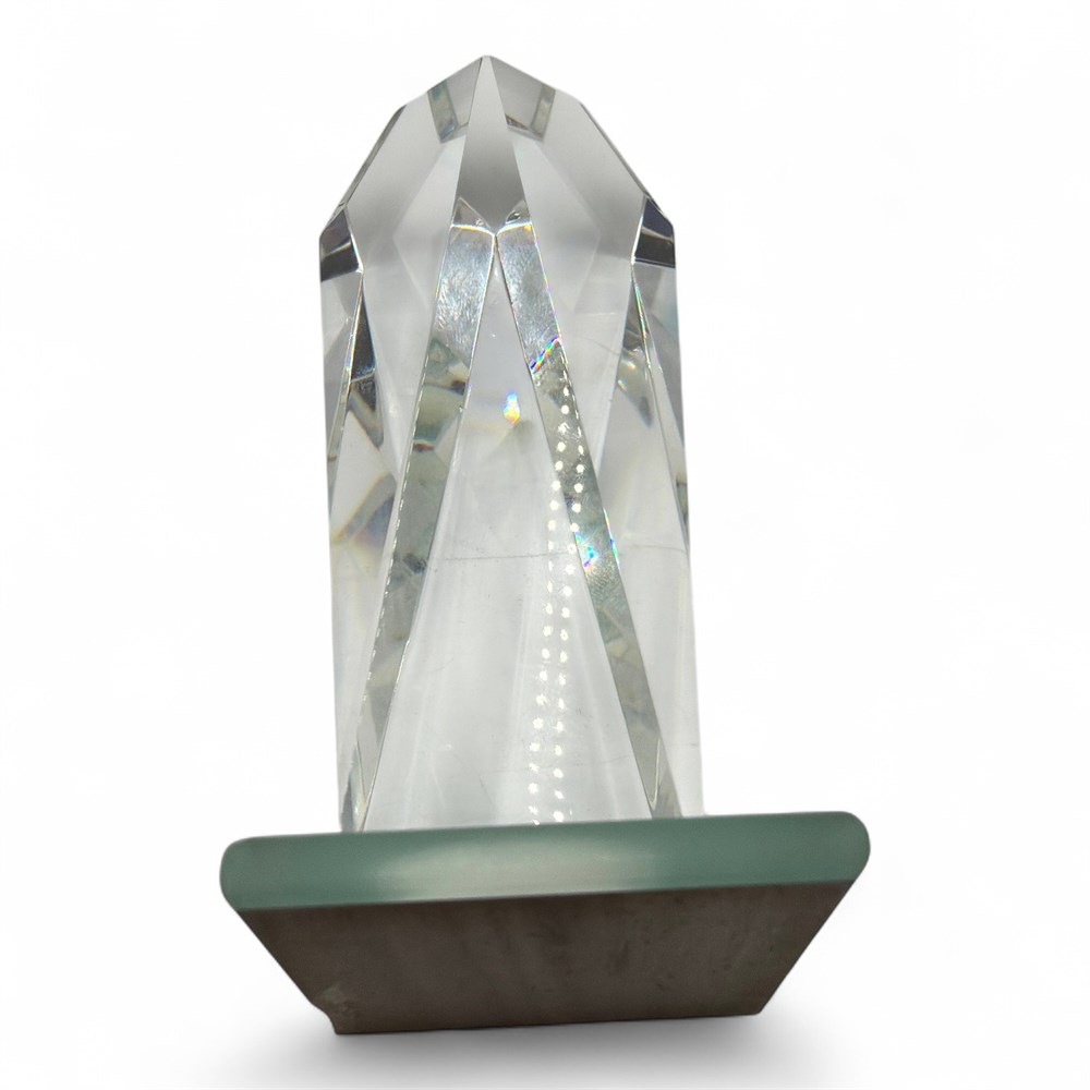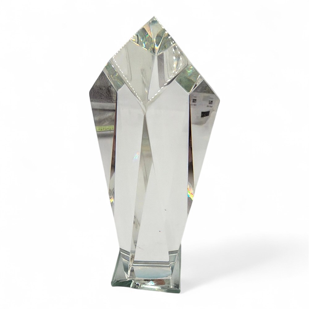A crystal award or trophy. It is designed with multiple facets and is typically made of optical crystal or glass. The item features a multi-faceted, tower or shard shape, often called an "Octagon Tower" or "Pillar Award". These items are commonly used as corporate awards, recognition gifts, or trophies. Base is 1 1/2 inch by one and a half inch. Height is 5 1/2 inch . Please note: there is a chip on the base.