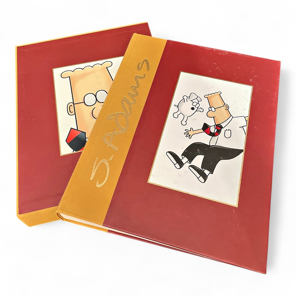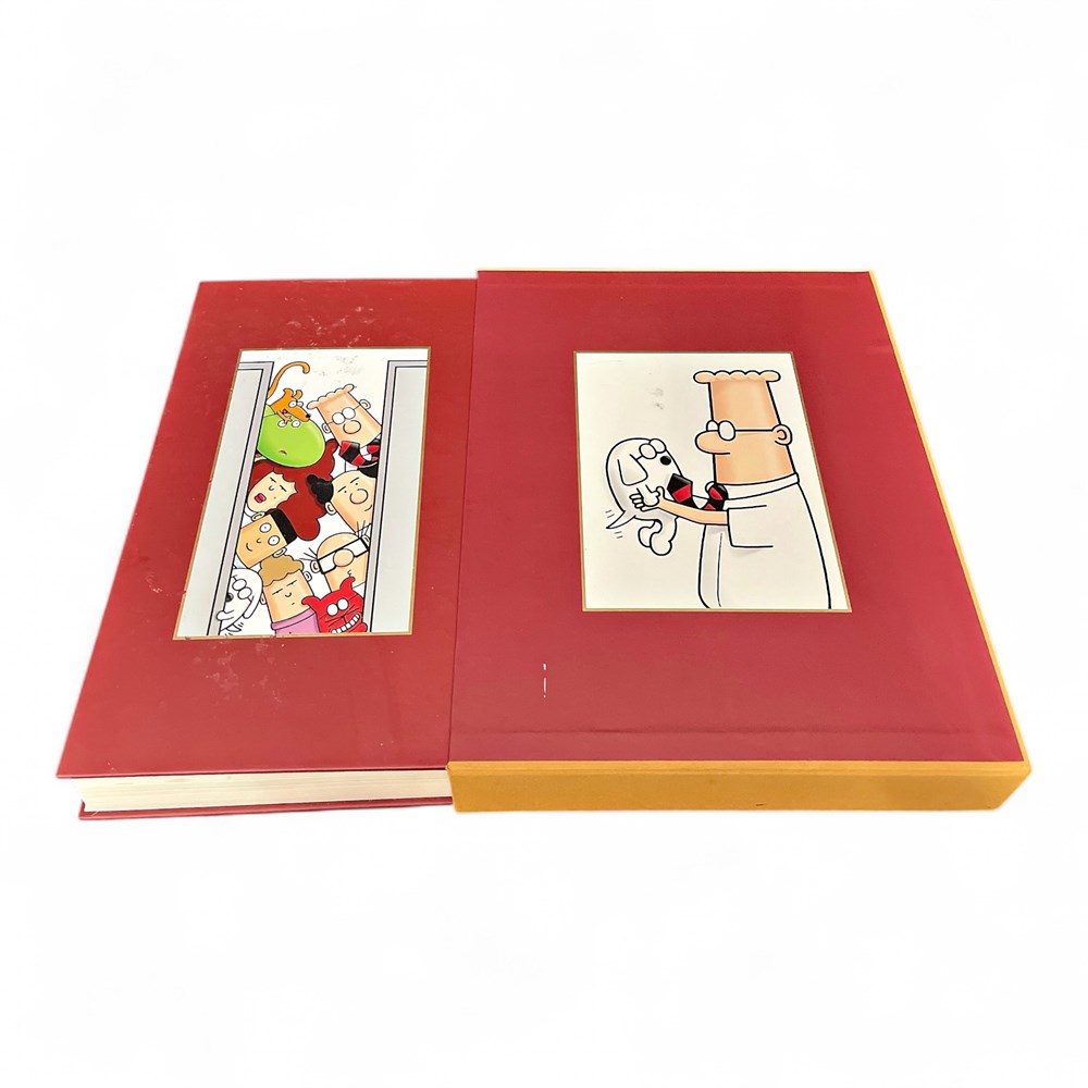 A Dilbert 2.0: 20 Years of Dilbert by Scott Adams book with protective slipcase. This comprehensive anthology was published in 2008 to commemorate the 20th anniversary of the Dilbert comic strip. The book contains nearly 2,000 cartoons hand-selected by Scott Adams, providing a retrospective look at the strip's evolution. 13.5" x 11" W Good condition.