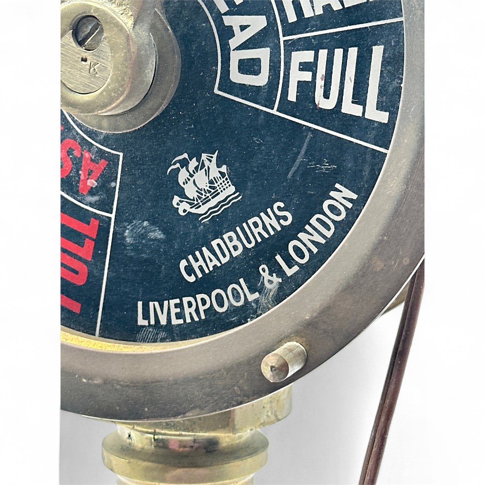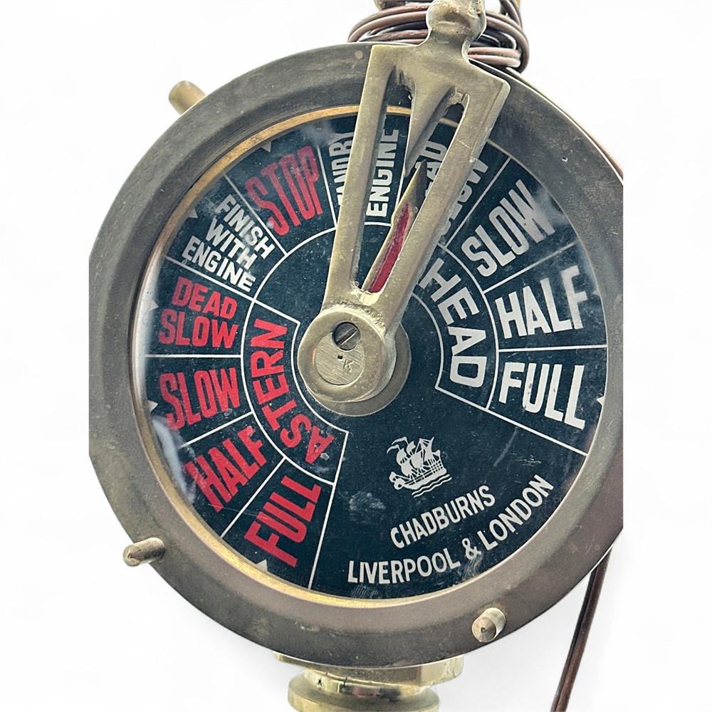 An antique brass Chadburns engine order telegraph with a wooden base that has been updated into a lamp. It is a maritime collectible that was originally used on ships to send commands from the bridge to the engine room. Includes commands like "FULL AHEAD," "HALF AHEAD," "SLOW AHEAD," and "DEAD SLOW". Made by Chadburn Ship Telegraph Co. Ltd., manufactured in the UK. 23" H Please note: Base unattached; no plug on power cord; bulb disconnected