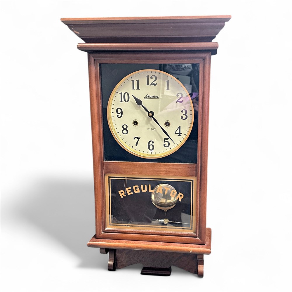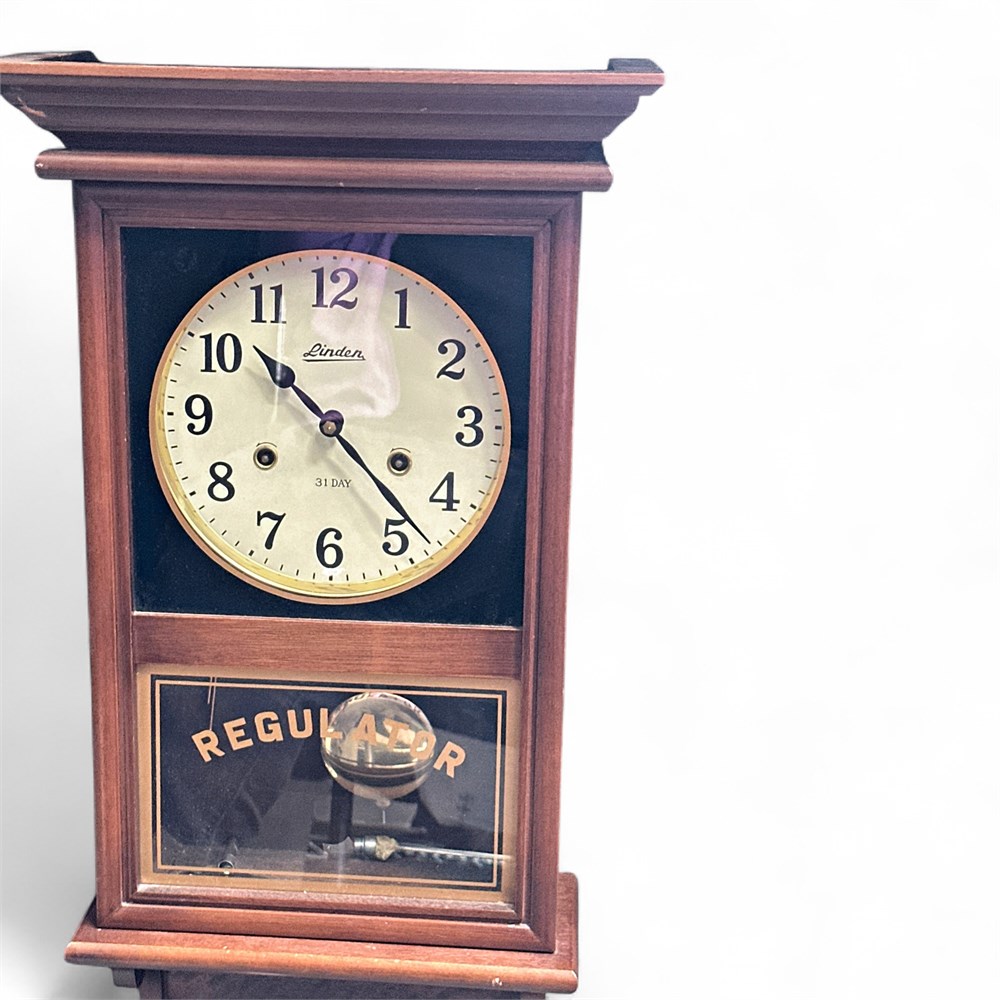 A Regulator wall clock, specifically identified as a Linden 31-day Regulator. These clocks are distinctive for their two-part glass door design, typically featuring a clock face in the top section and a "Regulator" inscription with a visible pendulum in the bottom section. It has a 31-day mechanical movement, meaning it typically requires winding once a month. Crafted from oak or other hardwoods with a polished finish. Features a "Regulator" graphic on the lower glass door, with gold-leaf style lettering. Comes with key for winding. 14" L x 6" W x 27" H Please note: small metal part is separated from whole; may need repair.