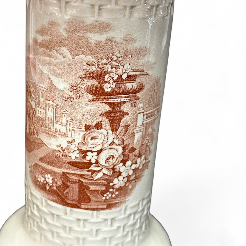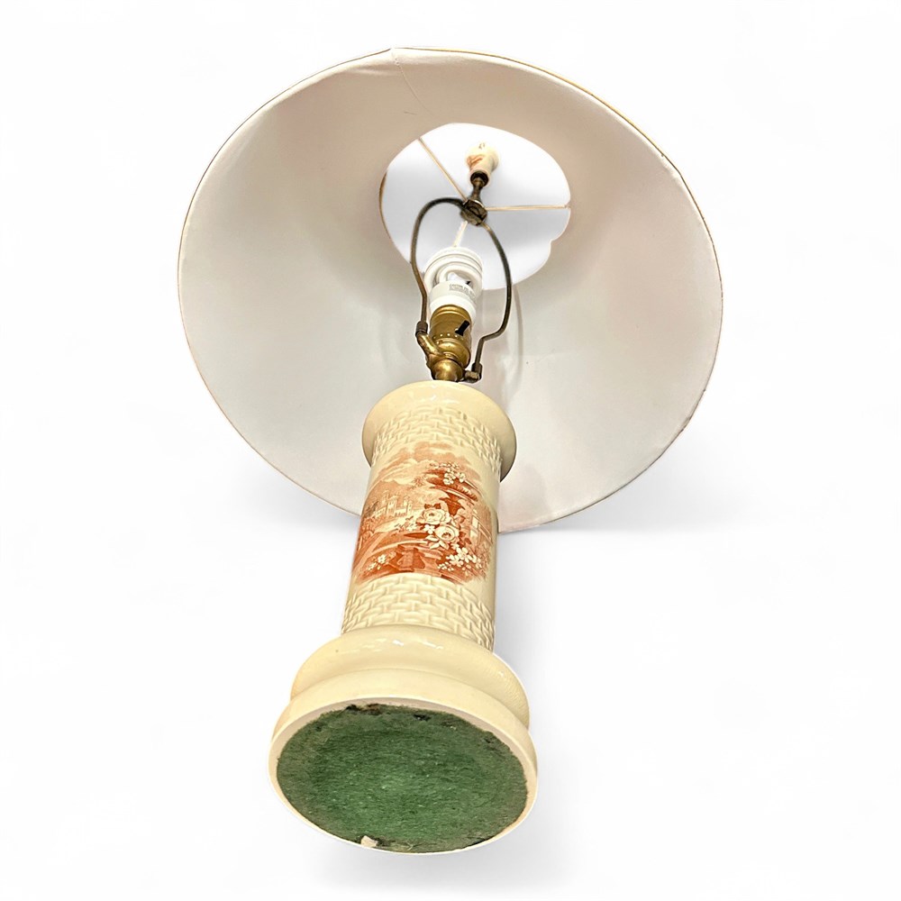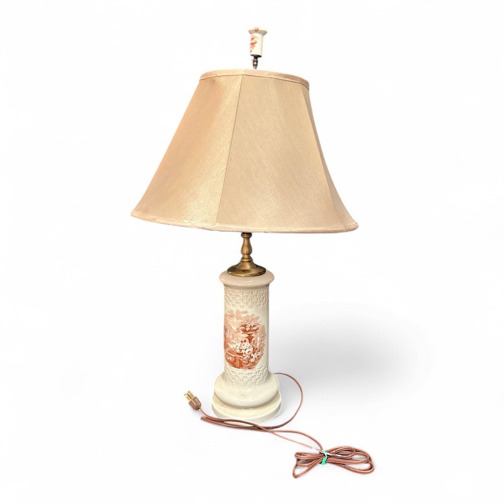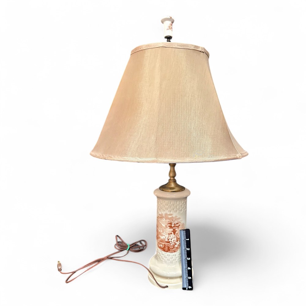 A vintage ceramic table lamp, often referred to as an "apothecary" or "vase-style" lamp, typically featuring hand-painted or transfer-printed pastoral or botanical scenes. These lamps were popular from the mid-20th century and often draw inspiration from European (French or Italian) porcelain designs. It has a fluted ceramic or porcelain body, in white, decorated with a scenic pastoral landscape with flowers. Paired with a fabric bell-style shade. 25 1/2" (at face) x 27 1/2" H Good condition.