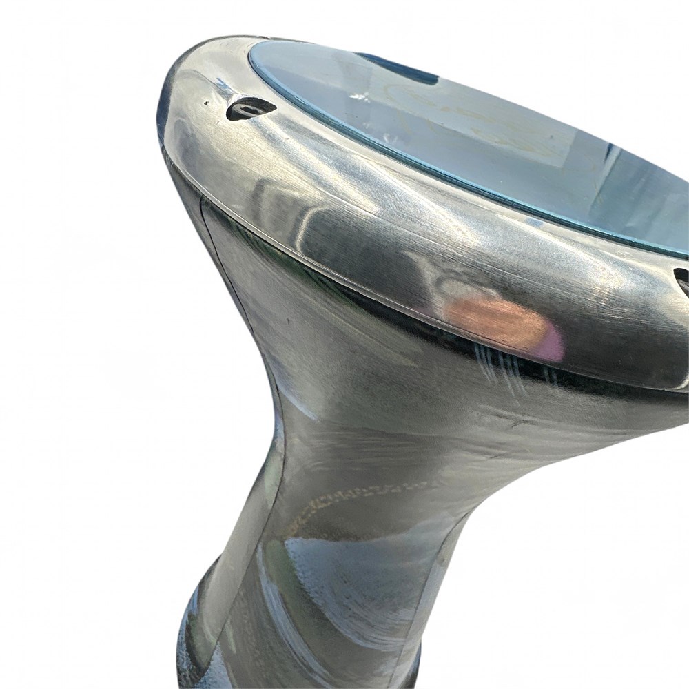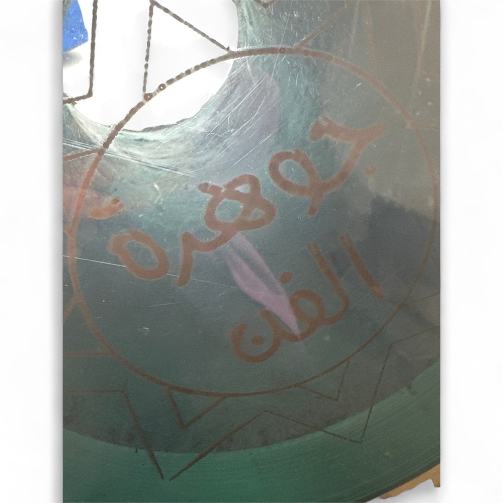 This percussion instrument is a goblet-shaped darbuka associated with traditional music of North Africa and the Middle East. It features a metal body with a synthetic drumhead secured by hardware around the rim. It displays Arabic text reading “Jawhara” on the drumhead with a star-like decorative motif. It produces a range of tones characteristic of darbuka construction when struck at different areas of the head. It measures 16.5 inches in height and 10 inches in top diameter, and is in good condition.