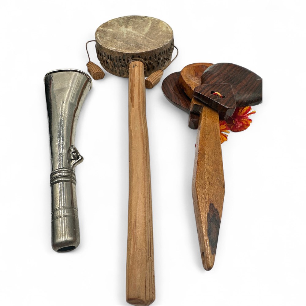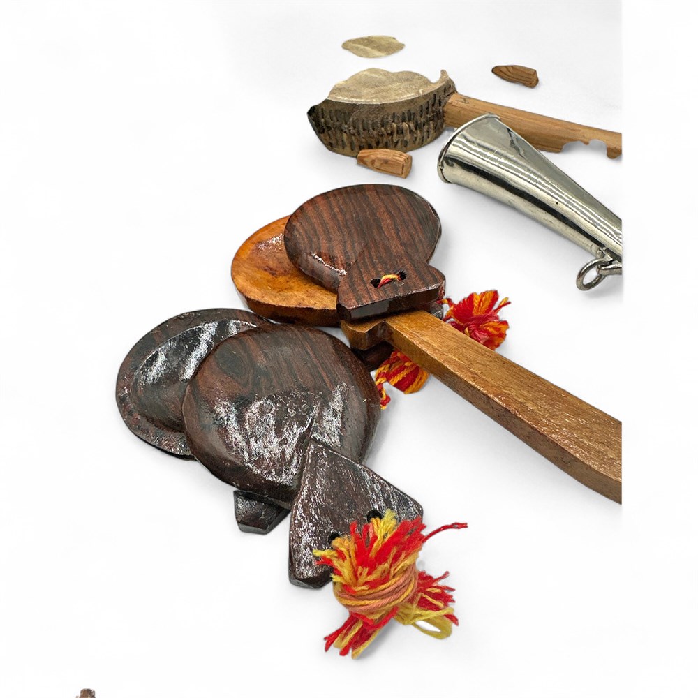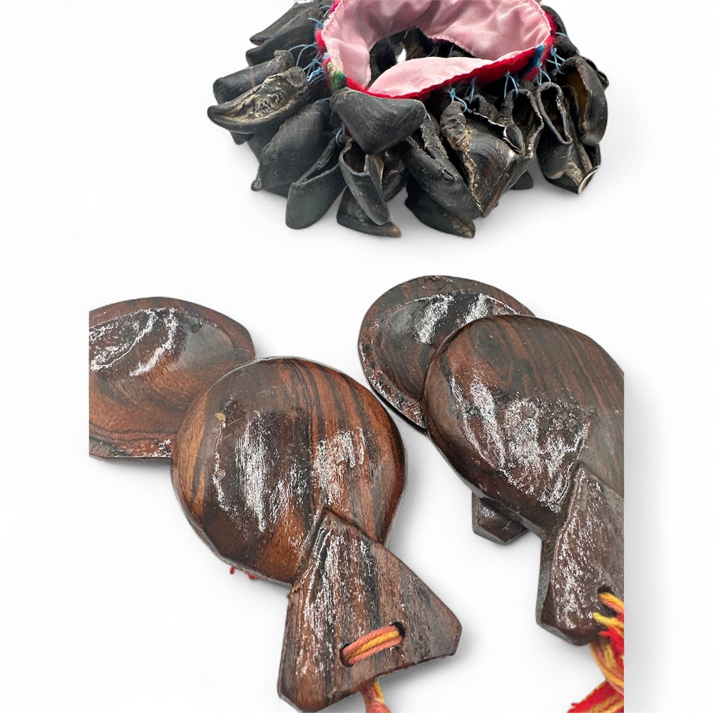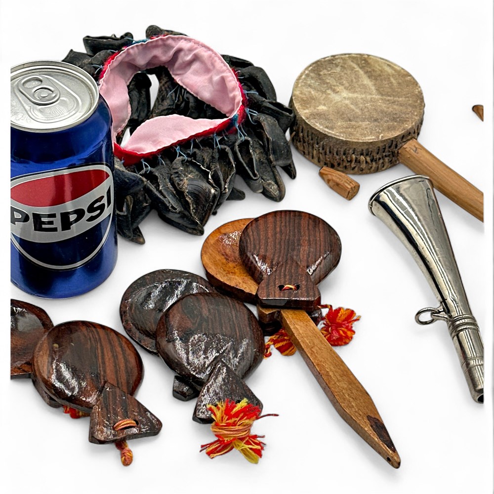 This lot includes a variety of traditional, hand-crafted percussion and sound-making instruments made primarily from natural materials such as wood, dried animal hooves, seed pods, and metal. The assortment reflects folk music traditions where simple organic materials are used for rhythm in dance, ceremony, or performance. The group features goat hoof rattles (chajchas) attached to a soft band for wrist or ankle wear, polished seed or nut shakers that produce a mellow tone, and a small double-sided hand or “monkey” drum with a wooden handle and natural skin head activated by twisting motion. Also included are a small silver-colored metal whistle or horn and pairs of smooth wooden clappers or castanet-style instruments tied with colorful cord for rhythmic clicking sounds. The longest instrument measures approximately 11 inches in length. All pieces are in good overall condition with light wear consistent with normal use.
