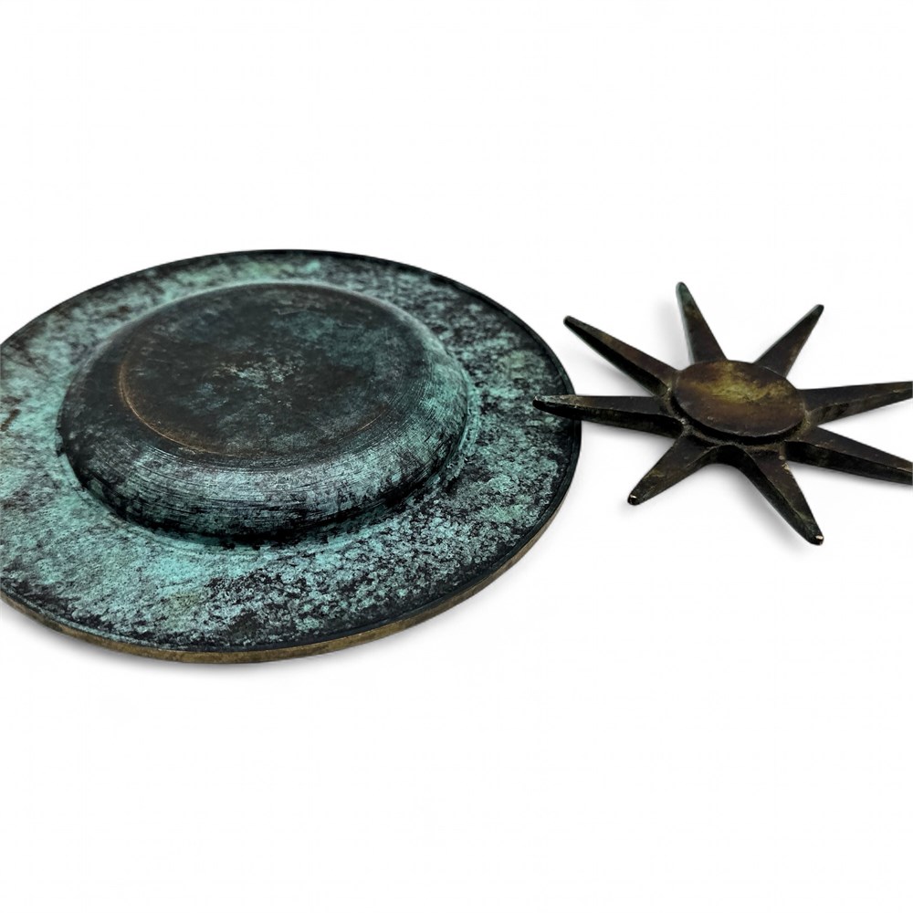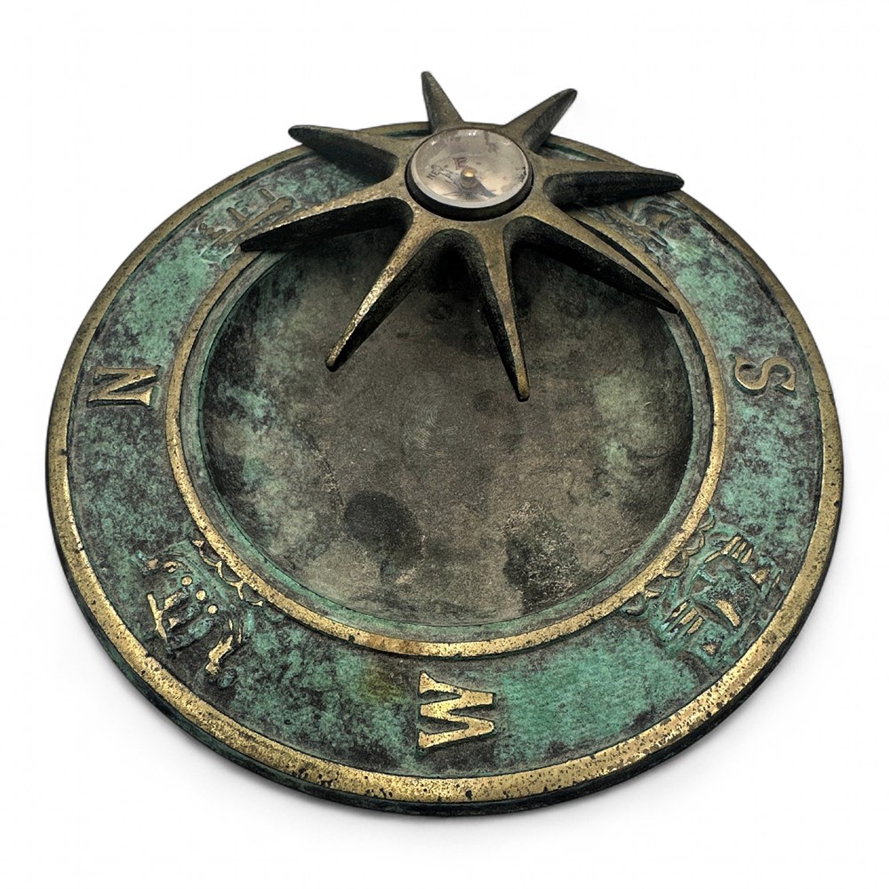 Decorative vintage-style compass rose crafted from cast brass or bronze with a natural green verdigris patina for an aged appearance. The circular design features a bold eight-pointed star indicating cardinal and intercardinal directions, with raised lettering and edges showing warm brass highlights. A small working magnetic compass is set at the center, with a tipped needle pointing north. The plate measures 6" in diameter and the itam is in good overall vintage condition.