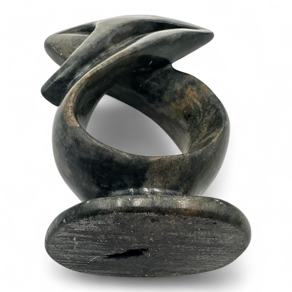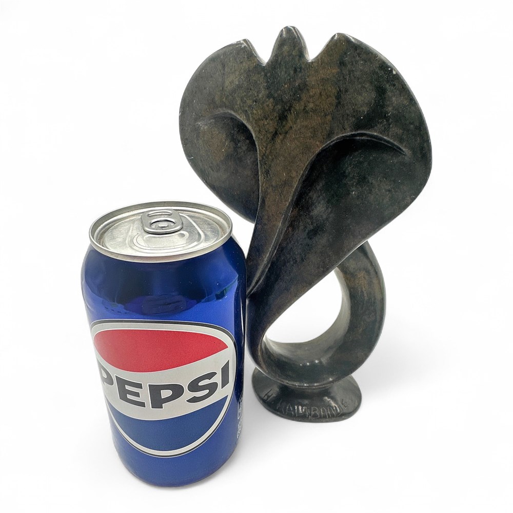 Hand-carved Shona stone sculpture from Zimbabwe, signed on the base “K. Kamanje” (or similar). Crafted from dark, variegated serpentine/soapstone and polished to a smooth, lustrous finish that highlights the stone’s natural color variations. The abstract, flowing form with open negative space reflects the modern Shona sculptural tradition, which emphasizes emotion, spirituality, and connection to nature through simplified organic shapes. Shona sculpture emerged in the mid-20th century and is internationally recognized for its skilled hand carving, locally sourced stone materials, and symbolic cultural themes. Height: 8". Condition: Good overall condition with light age-appropriate wear.