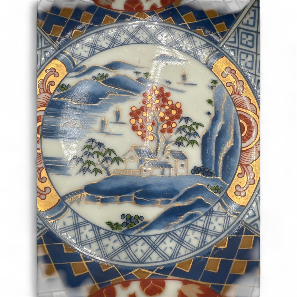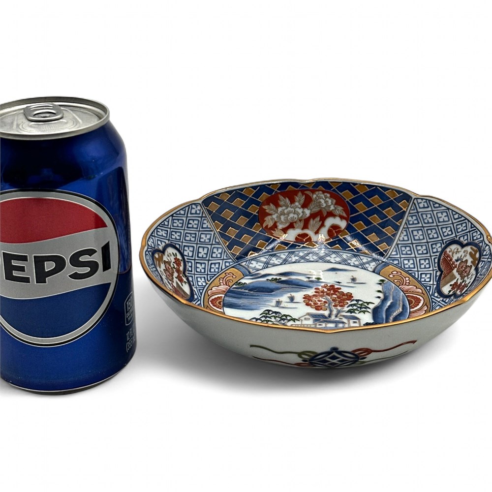A 20th-century ceramic serving bowl produced at the Kozan kiln in the Gifu region of Japan and imported to the United States by Otagiri Mercantile Company (OMC), a well-known Japanese trading firm founded in 1954. The bowl showcases classic Mino ware styling with a rich palette of cobalt blue, iron red, and gold accents, combining geometric border patterns with a finely hand-painted central mountain village landscape. A faint original OMC gold foil label and base stamp remain present. Size: 7" diameter × 2" high. Condition: Good vintage condition with light, age-appropriate wear.