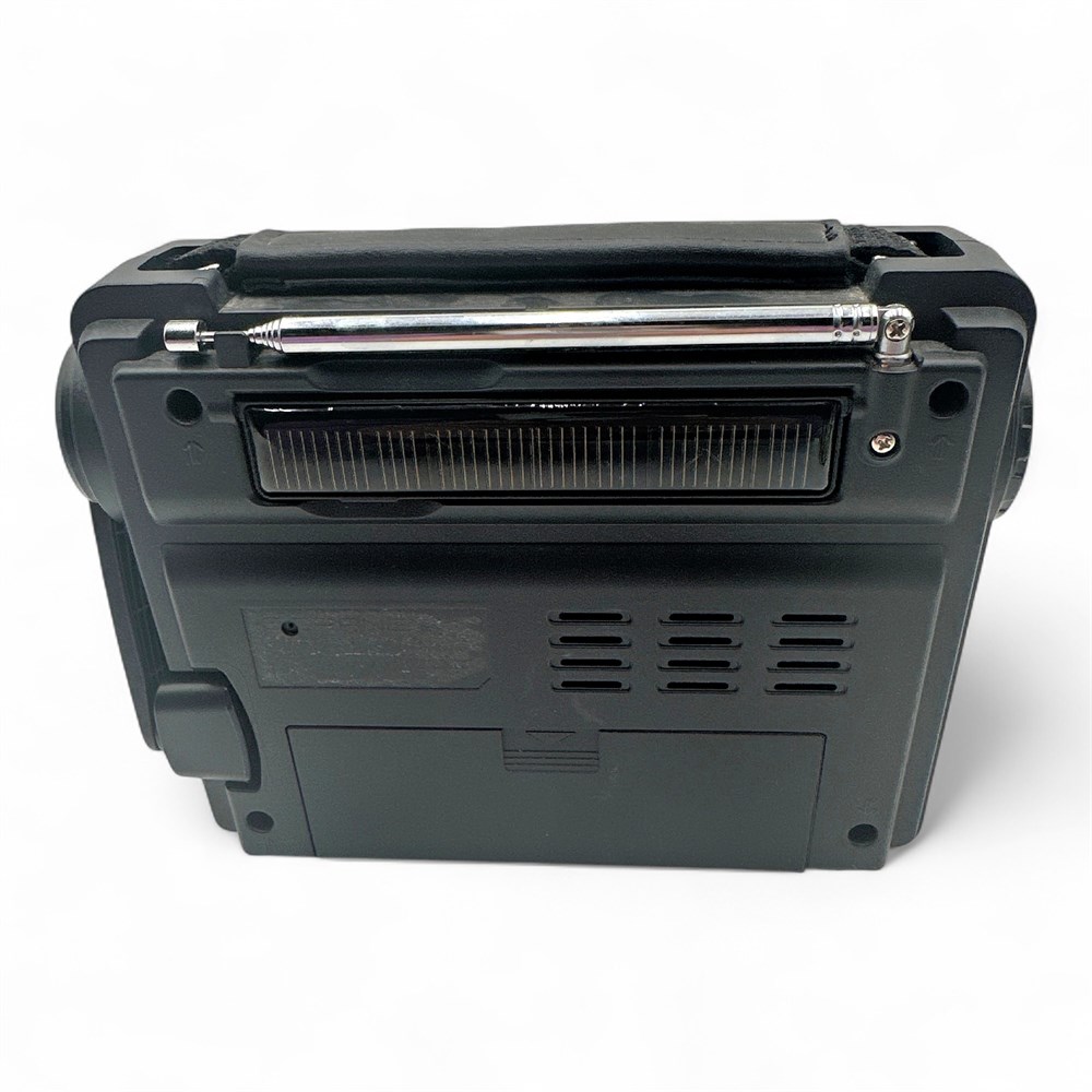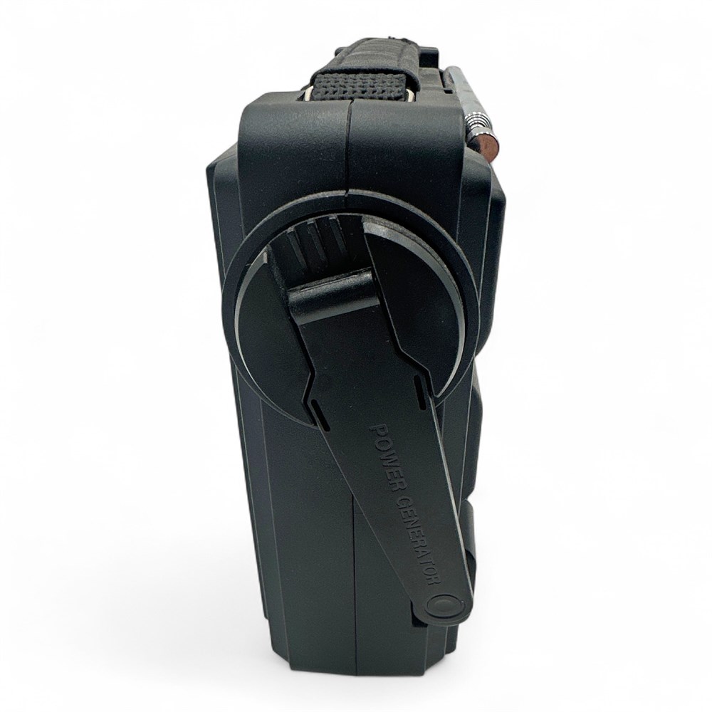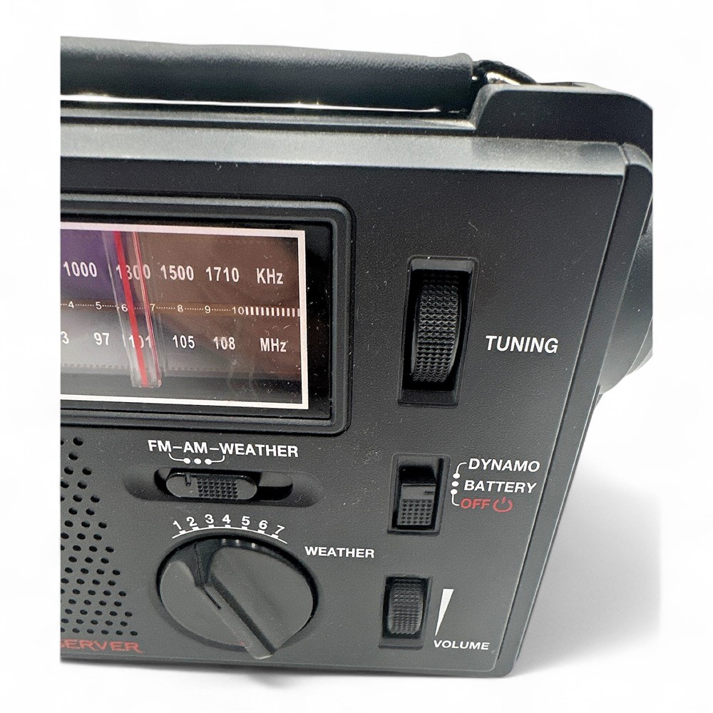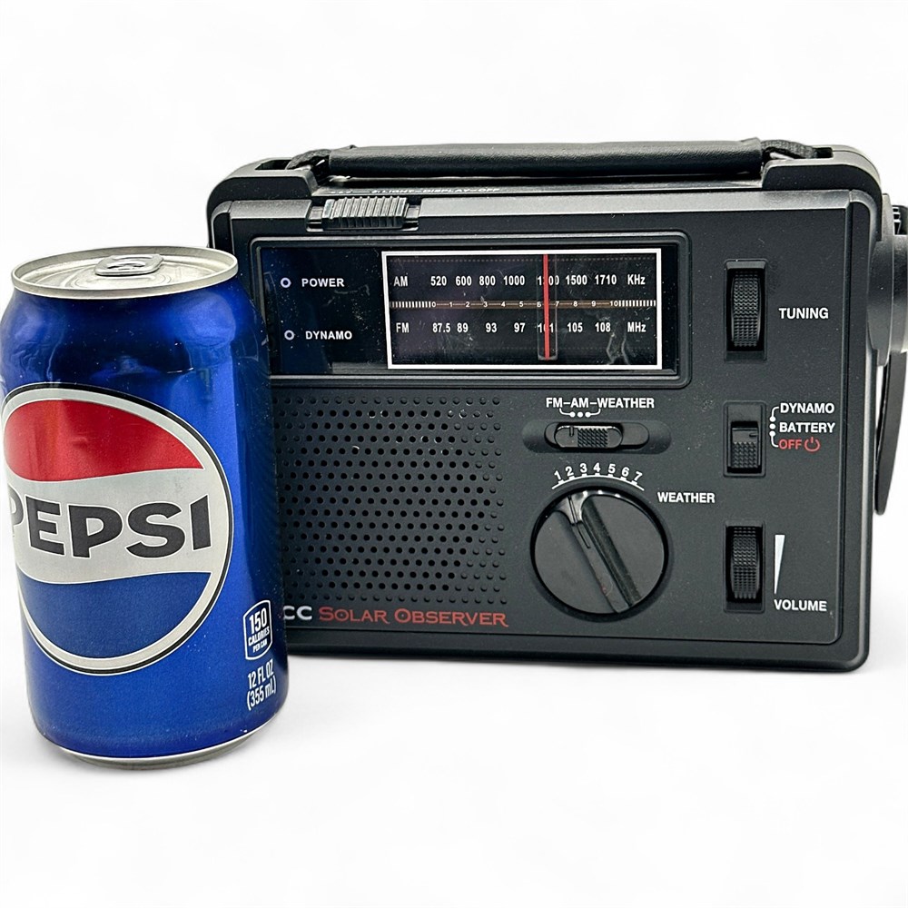 A C. Crane CC Solar Observer personal emergency radio in black, designed for preparedness, travel, and everyday portable listening. This compact unit receives AM (520–1710 kHz) and FM (87.5–108 MHz) broadcasts and features multiple power options. The radio can be powered by its built-in rechargeable battery, which charges through the integrated solar panel, hand-crank dynamo, optional AC adapter, or three AA batteries. Approximately 8 hours of full sunlight provides 4–6 hours of playtime, while 90 seconds of hand-cranking yields about 12 minutes of listening. Additional features include a built-in flashlight, easy-to-read analog tuning dial, volume and band controls, headphone jack for private listening, and a durable carrying handle. Dimensions: 7" L × 2" W × 5½" H. Condition: Good overall condition with light normal wear consistent with use.