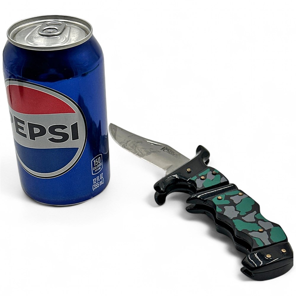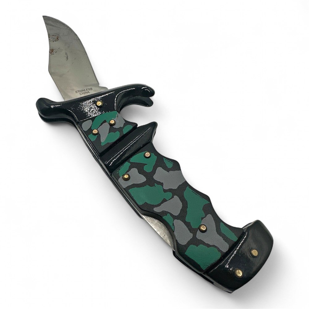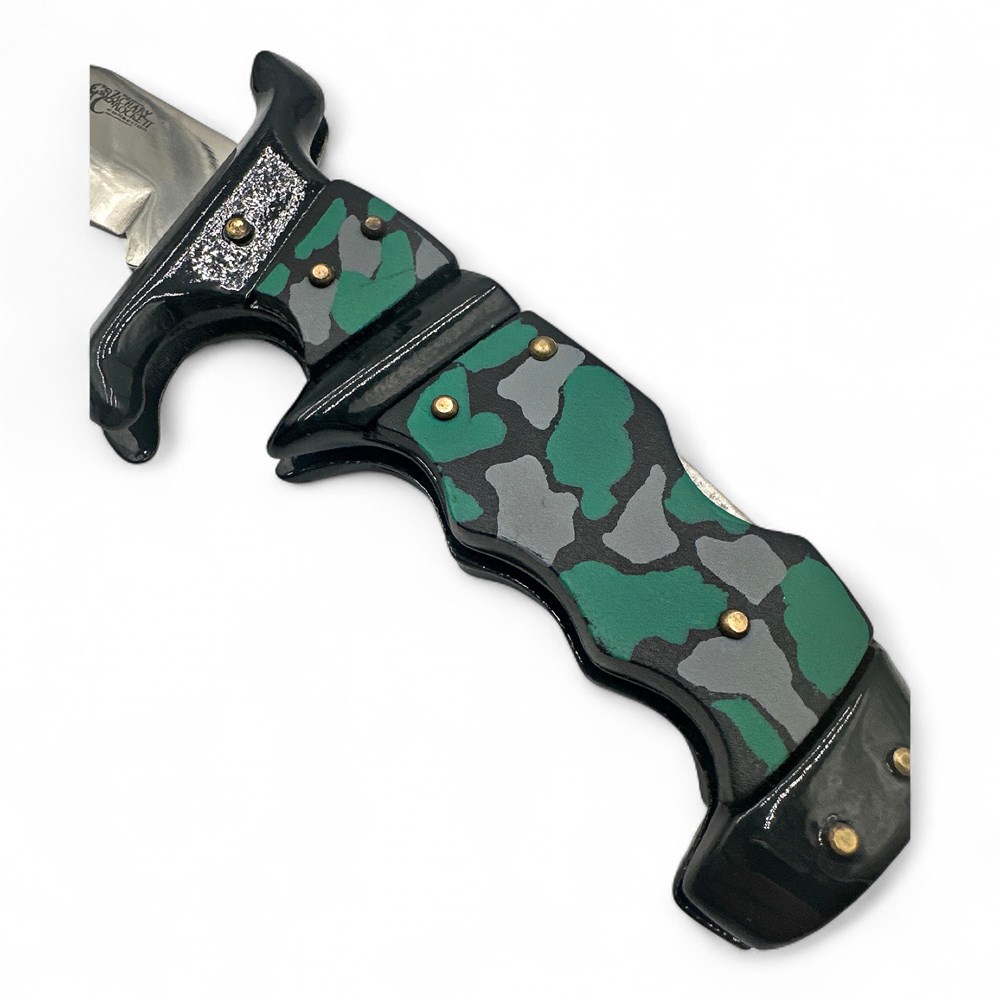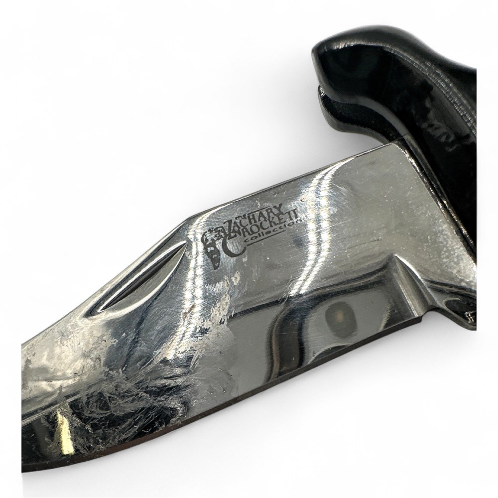 Folding lock-back knife from the Zachary Crockett Collection. Stainless steel drop-point blade with plain edge and tang stamp reading “Zachary Crockett Collection,” reverse marked “Stainless China.” Ergonomic handle with finger grooves, glossy black finish, and green/gray camouflage inlay secured by brass-tone pins. Prominent integral finger guard at pivot. Measures approximately 8 in. overall length when open. Pre-owned condition with visible surface wear and scratches to blade; handle intact.