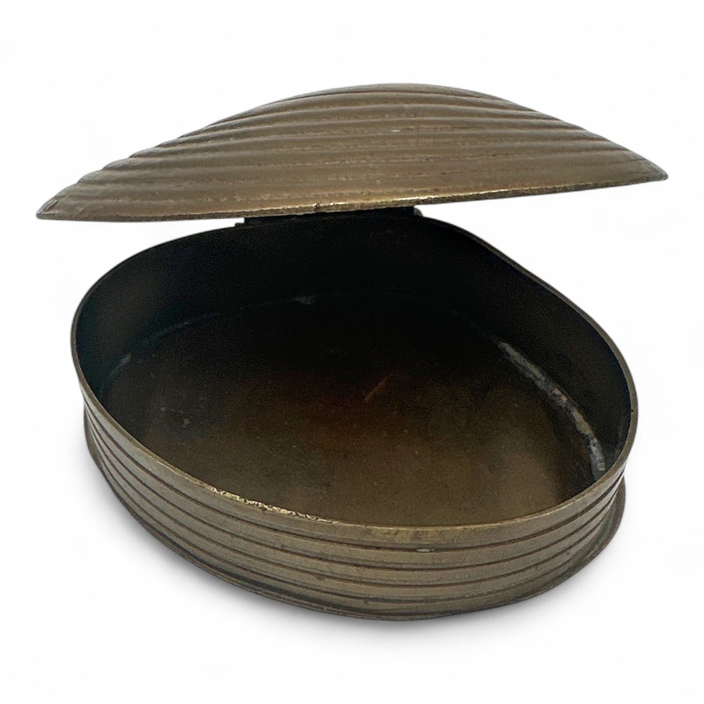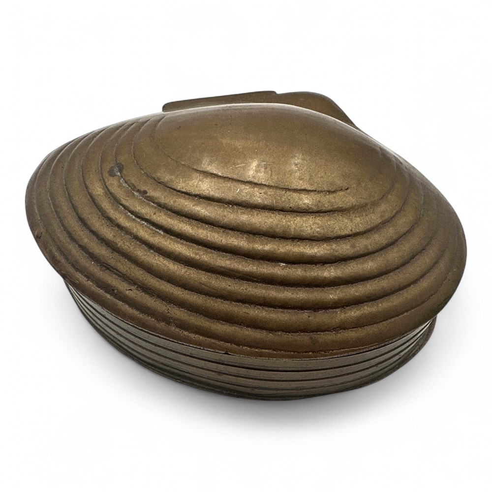 Small vintage trinket box formed in the shape of a clam shell, constructed of brass with a naturally aged patina. Hinged lid with ridged exterior detailing and smooth interior cavity suitable for holding rings, coins, or other small items. Made in India. Measures approximately 3 in. L x 2 in. W x 1 in. H. Overall good vintage condition with surface wear and patina consistent with age and use.