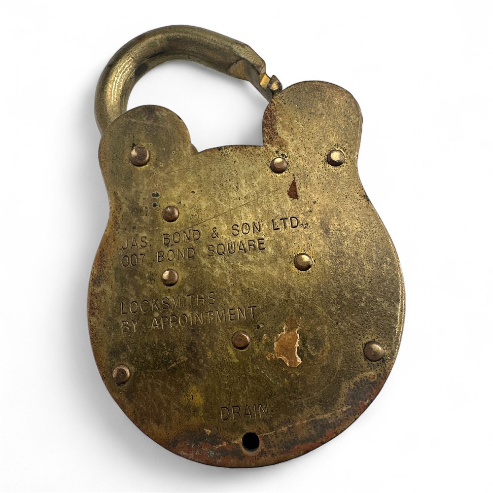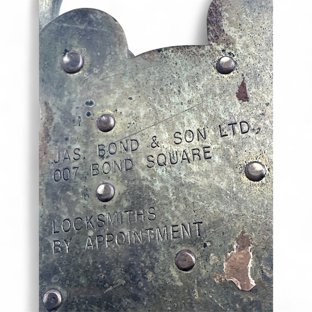 Vintage English-made solid brass padlock stamped “2 ADMIRALTY JAREO FOUR BRASS LEVERS GENUINE SOLID BRASS” on the front and “JAS. BOND & SON LTD., 007 BOND SQUARE, LOCKSMITHS BY APPOINTMENT, DRAIN” on the reverse. Constructed of genuine solid brass with a traditional four-lever locking mechanism. Includes one working key. Measures approximately 2½" L x 3½" W x ½" H. Good vintage condition showing surface wear, oxidation, and patina consistent with age and normal use. No major structural damage observed.