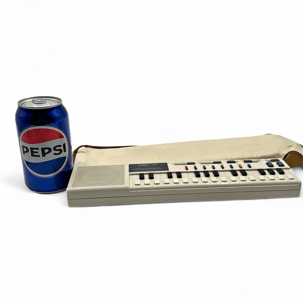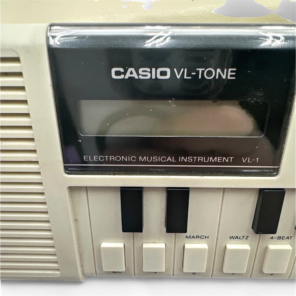 Casio VL-Tone VL-1 electronic musical instrument, introduced in 1981. Compact unit combines a monophonic synthesizer, calculator, step sequencer, preset rhythms, and built-in speaker in a single portable design. Features 29-button keyboard layout, octave selector, programmable sound entry via calculator keys, small LCD display, volume and tempo controls, and multiple preset tones and rhythm patterns. Includes original fitted protective case. Measures approximately 12" L x 3" W. Condition: Good vintage condition with visible surface wear, age discoloration, and light cosmetic marks consistent with normal use.