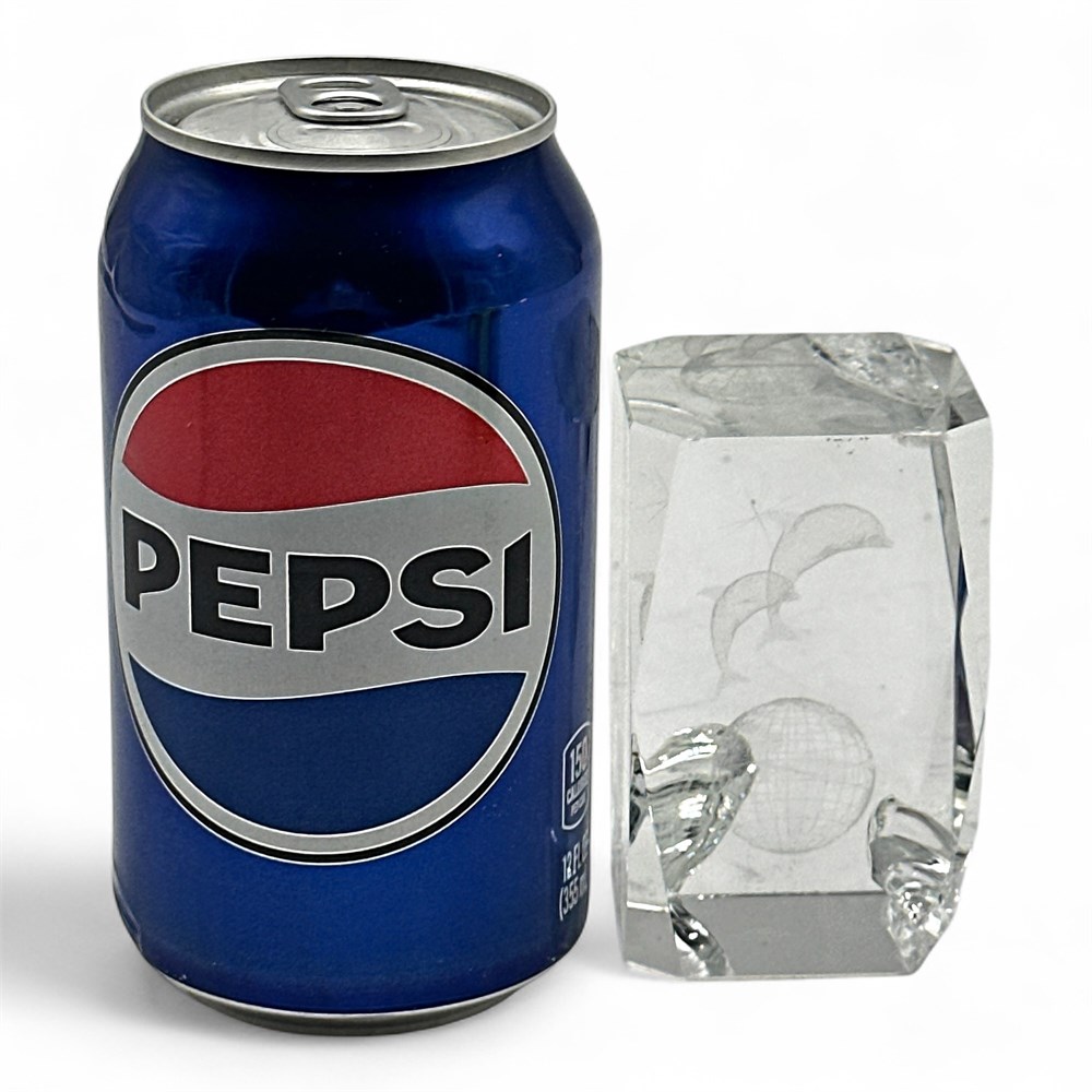 A glass paperweight, that has been etched to show a pair of dolphins jumping over a globe. 2" L x 2" W x 3" H Please note: item is chipped.