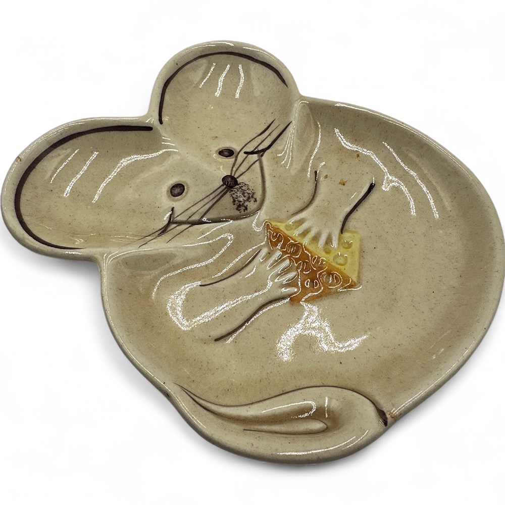A vintage N.S. Gustin ceramic mouse dish, also used as a spoon rest or small cheese tray. It is made of hand-painted pottery and features a mouse holding a piece of cheese. The piece is associated with Los Angeles Pottery. 6" across; 7" L Good condition.