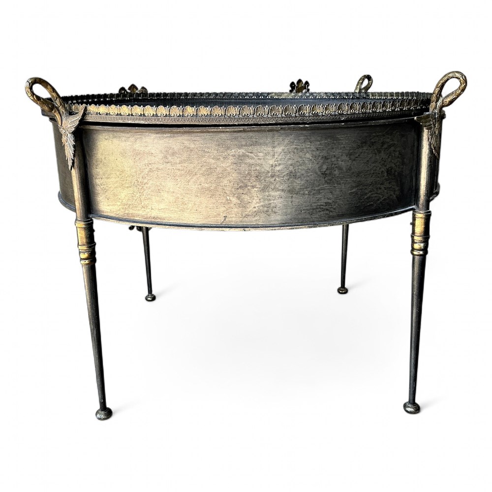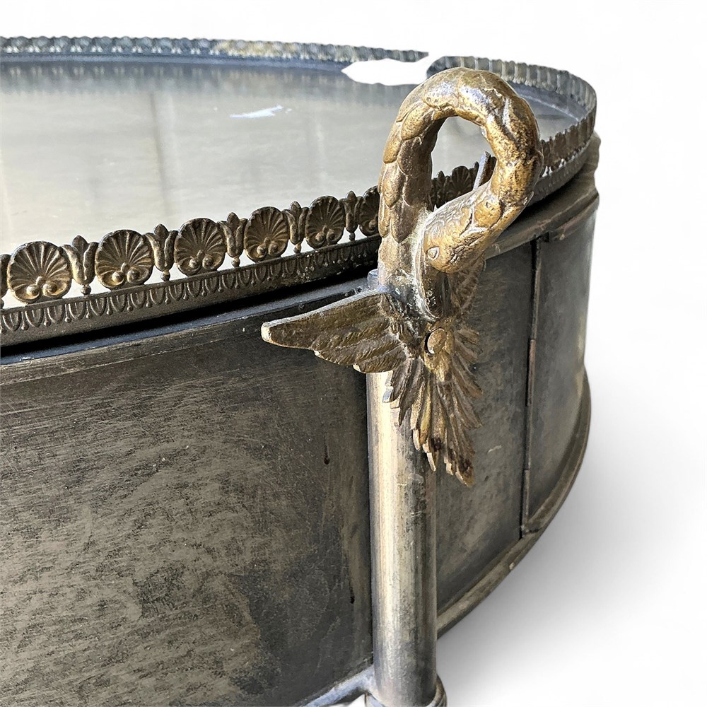 A Trouvailles French Empire style metal drum table. It is crafted in the French Empire style, featuring a charcoal patinated steel body with brass or gilded accents. The table is known for its swan-neck handles or tray supports and wing motifs. These tables were primarily produced by Trouvailles Inc., a company based in Watertown, MA, and date to the mid-20th century (c. 1970s). 31" x 31.5" H Good condition.