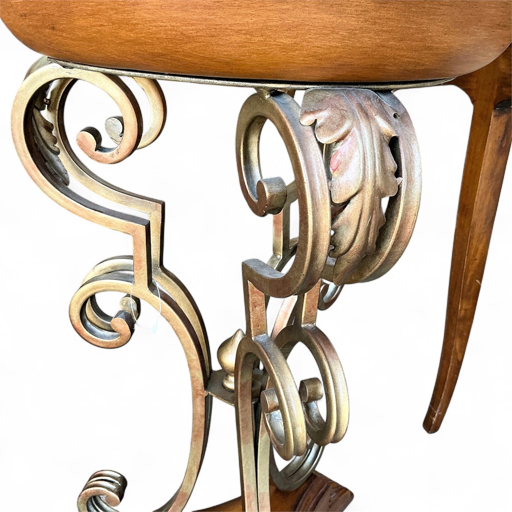 Classic decorative pedestal featuring a mixed wood and metal construction with ornate scrollwork. The circular top includes an inset marble center surrounded by a molded wooden rim. The pedestal structure is formed with curved metal supports in an antique gold/bronze finish, rising from a carved wooden base with stylized feet. Designed for use as a plant stand, accent pedestal, or decorative display piece in a living room, hallway, or sunroom. Dimensions: 16" diameter x 26" height. Condition: Good overall condition with normal surface wear consistent with age and use.
