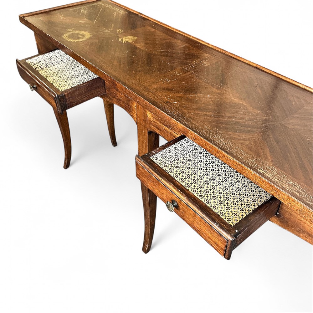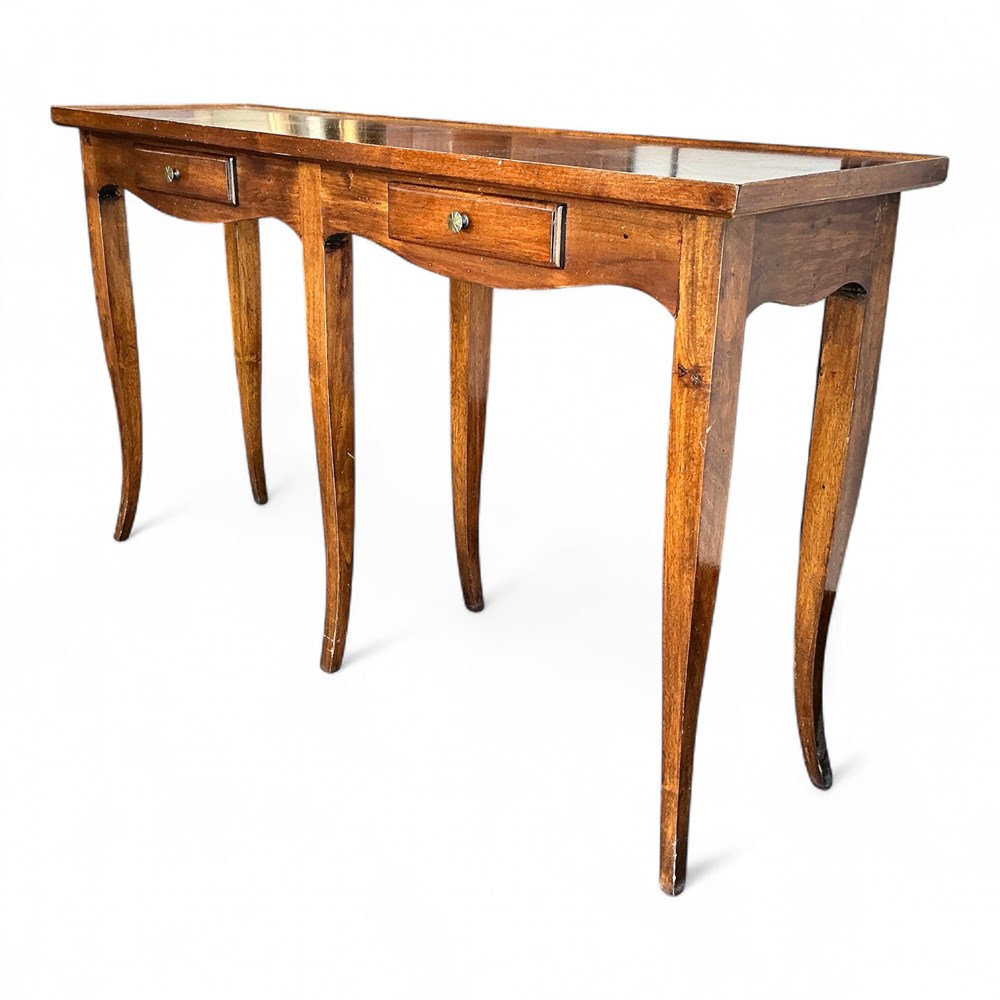 Crafted from solid wood, the table features a warm medium-brown finish with visible grain and a lightly worn, aged surface consistent with vintage use. The rectangular top shows decorative veneer patterning and minor surface wear. The form is defined by elegant cabriole legs with gentle S-curves, supporting a shaped apron along the front and sides. Two functional drawers are integrated into the apron, each fitted with metal pull hardware and lined interiors. Proportions are long and narrow, suitable for placement in an entryway, hallway, or behind a sofa. Overall condition is good with expected finish wear from age and use. Dimensions: 44" L × 12" W × 24" H.