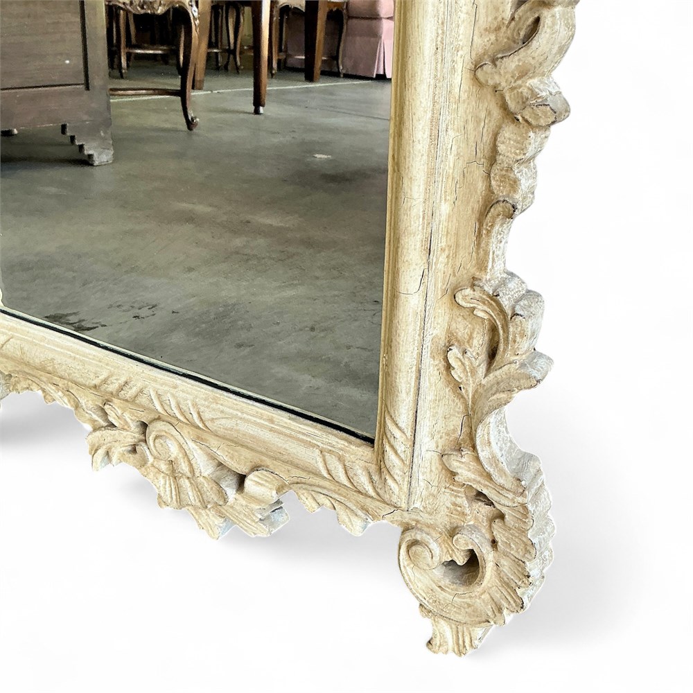 Antique 19th-century French Louis XV style wall mirror executed in the Rococo tradition. The frame is finely hand-carved wood featuring pronounced scrolling acanthus leaves, floral ornament, and rocaille shell motifs in high relief. The overall serpentine and asymmetrical composition reflects classic Louis XV design, crowned by an elaborate pierced crest and continuing with deeply carved side flourishes and lower apron detail. Finished in a painted cream patina with visible age-appropriate wear, surface cracking, and minor losses consistent with period use. Fitted with beveled mirror glass within the original carved surround. Solid and structurally sound decorative example of French revival craftsmanship. Measures 27" W x 51" H. Good antique condition consistent with age and normal use.