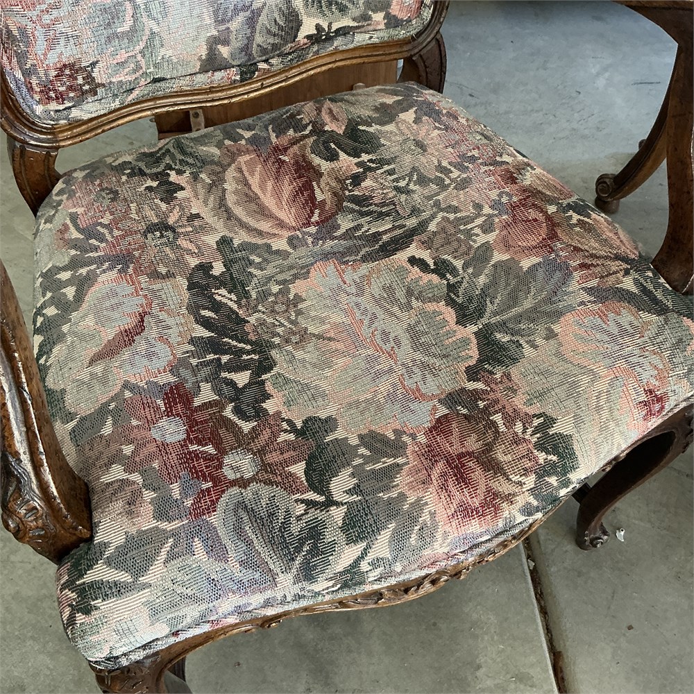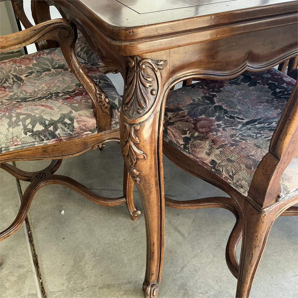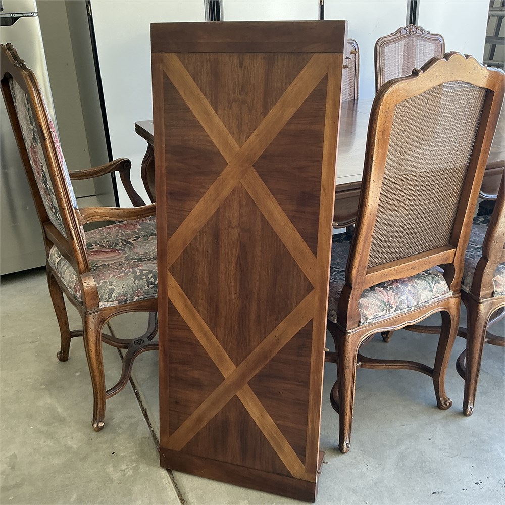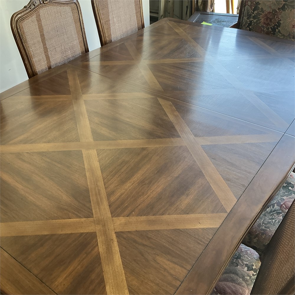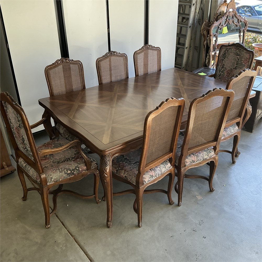 A French Provincial or French Country style dining set featuring a wood table with a parquet top and eight cane-back chairs with upholstered seats. The dining table features traditional details, including intricately carved legs and curved corners. The tabletop has a herringbone plank design. The set includes eight deeply padded chairs, two of which are armchairs. The chairs feature floral chenille jacquard upholstery and have caned back panels. The set is crafted from wood, likely mahogany or cherry, in a traditional, elegant style. 72" L x 46" W x 30" H, Comes with 17" W extension Good condition.