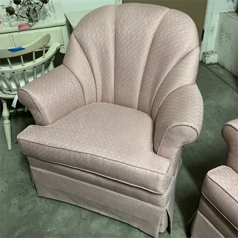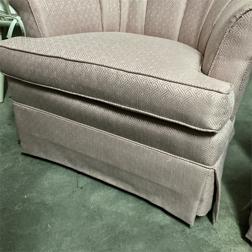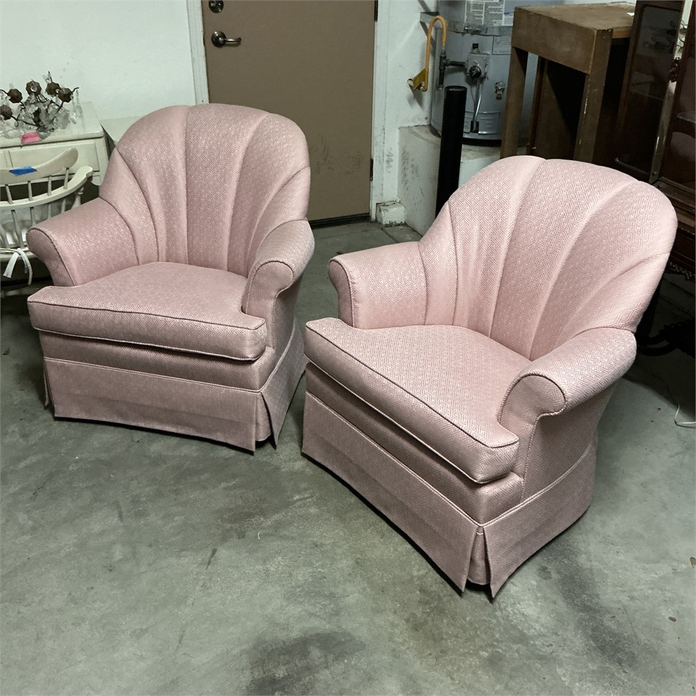 A pair of Mid-Century Modern style channel-back club swivel chairs. These chairs feature a distinctive "shell" or "channel-back" design with a skirted base that often hides a 360° swivel and rocking mechanism. Upholstered in a ilght pink, woven textile with a subtle geometric pattern. 36" L x 33" W x 34" H Good condition.