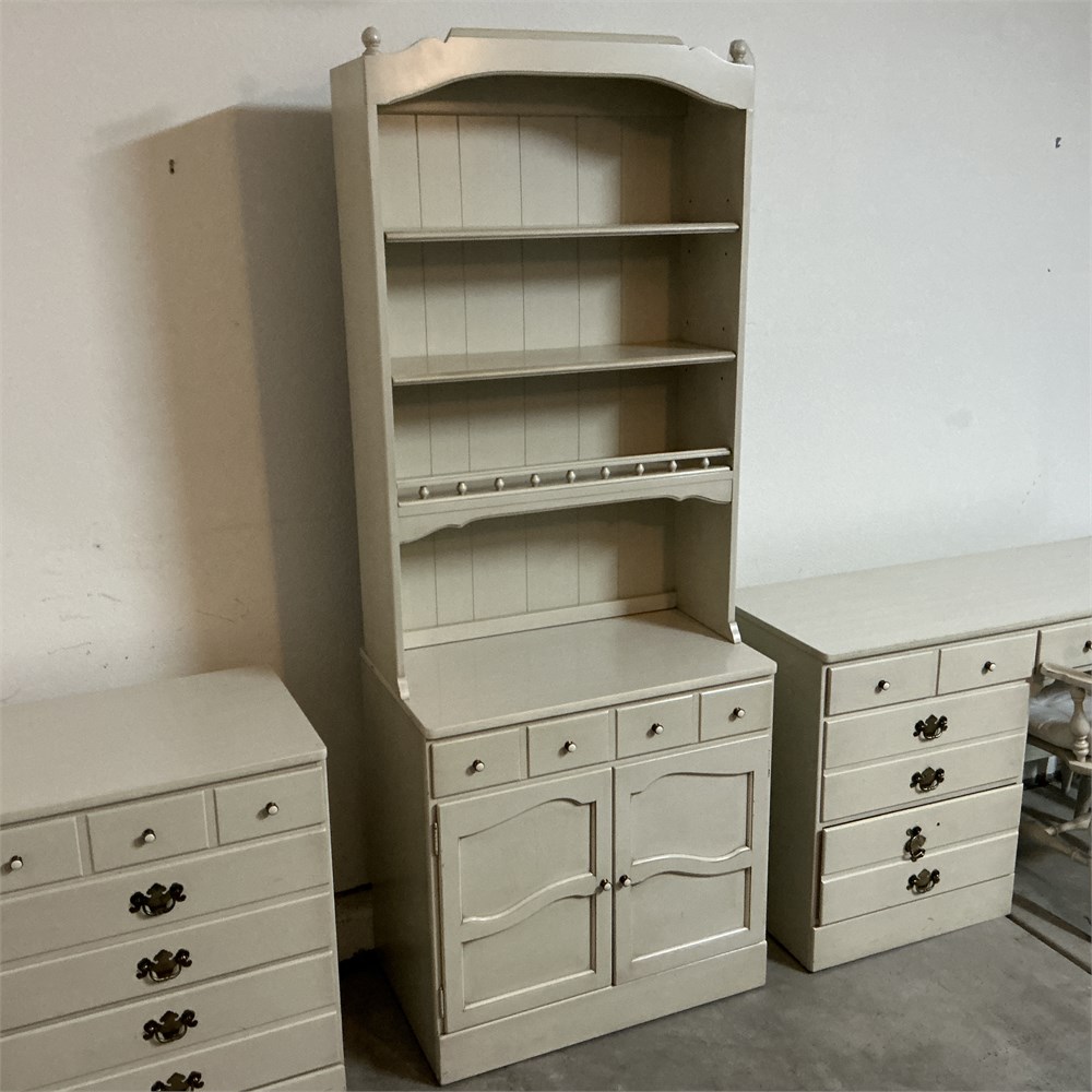 Vintage Ethan Allen Heirloom Collection bedroom furniture set from the Custom Room Plan line, produced circa 1970s–1980s, constructed of solid wood, likely maple, with a cream/off-white painted finish and original antique-brass tone hardware, reflecting Early American and Colonial Revival styling with simple lines, turned elements, scalloped hutch detail, and traditional drawer construction; the coordinated set includes a dresser (48" W × 18.5" D × 30" H), hutch/bookcase cabinet (30" W × 18.5" D × 78" H), vanity/desk (48" W × 18.5" D × 30" H), and nightstand (16" W × 14" D × 27" H), all in overall good vintage condition with surface wear consistent with age and normal use.