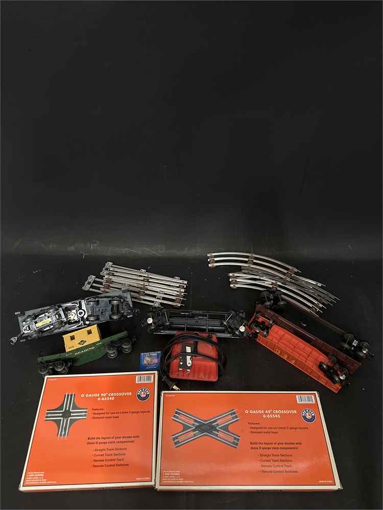 A collection of Lionel O-gauge model train items, including track sections, various train cars, and empty product boxes. Lionel Corporation has been a prominent name in the model railroad industry since its founding in 1900. The items are O-gauge scale, a popular size for model railroading. The collection includes a mix of locomotives, freight cars, and track pieces. The boxes feature the classic orange and blue Lionel logo. Straight tracks: 9" L; Curved tracks: 10.5" L; Longest train car: 11" L Good condition.