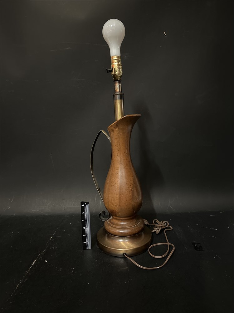 A vintage Mid-Century Modern style ewer/pitcher motif lamp, made of teak wood and brass. The lamp has a distinctive ewer or pitcher shape, characteristic of Mid-Century Modern design. Shade not included. 28" H Good condition.