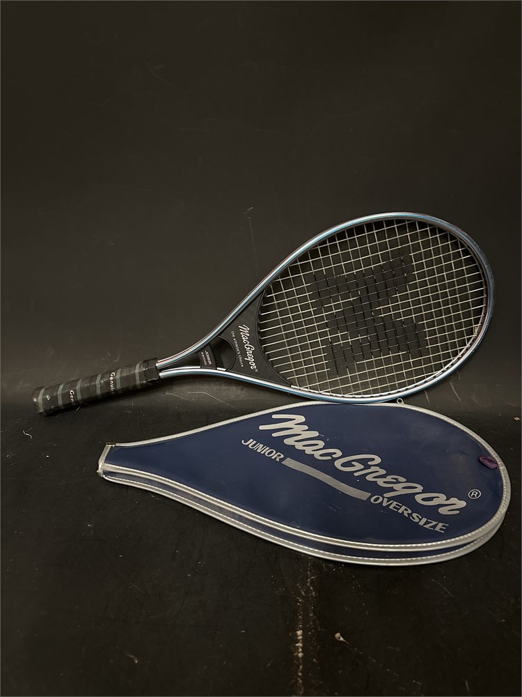 A vintage MacGregor Junior Oversize tennis racquet with its matching cover. Aluminum frame with nylon strings and 4 1/8" grip size for these junior models. Includes a protective carry case. 25" L x 10.5" W Good condition.