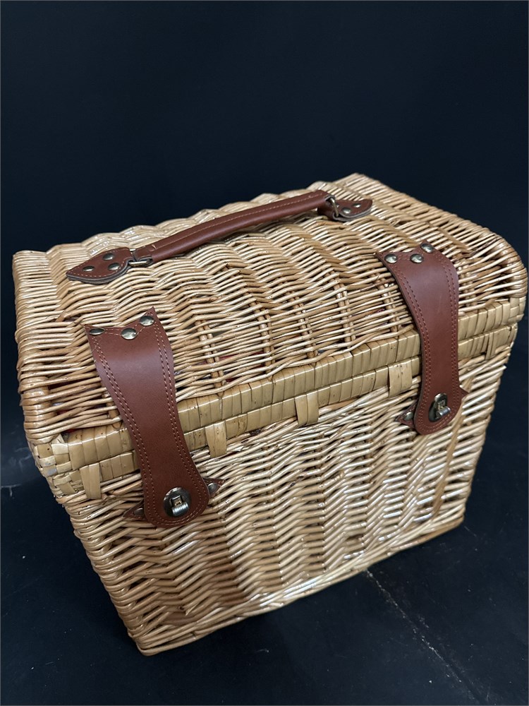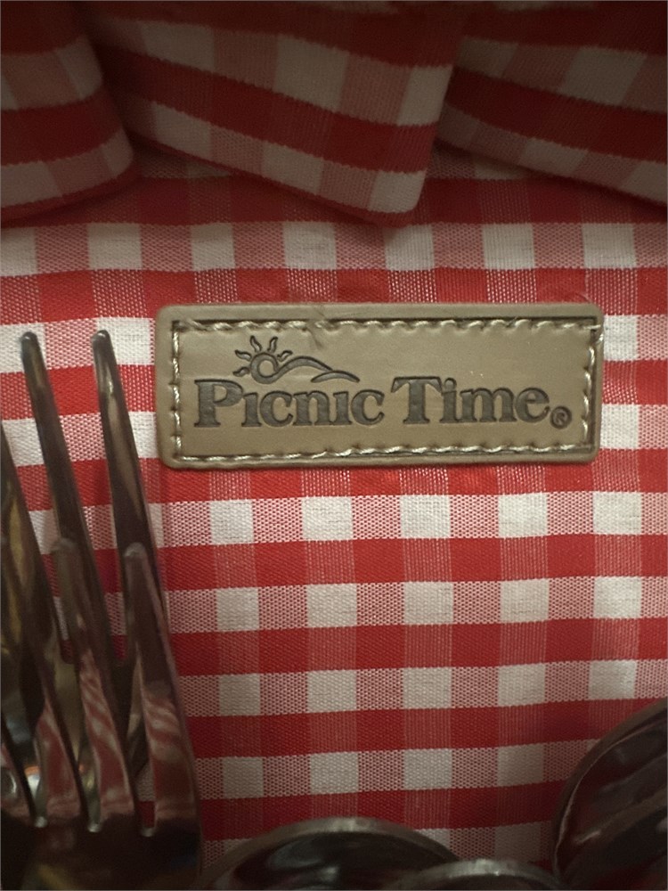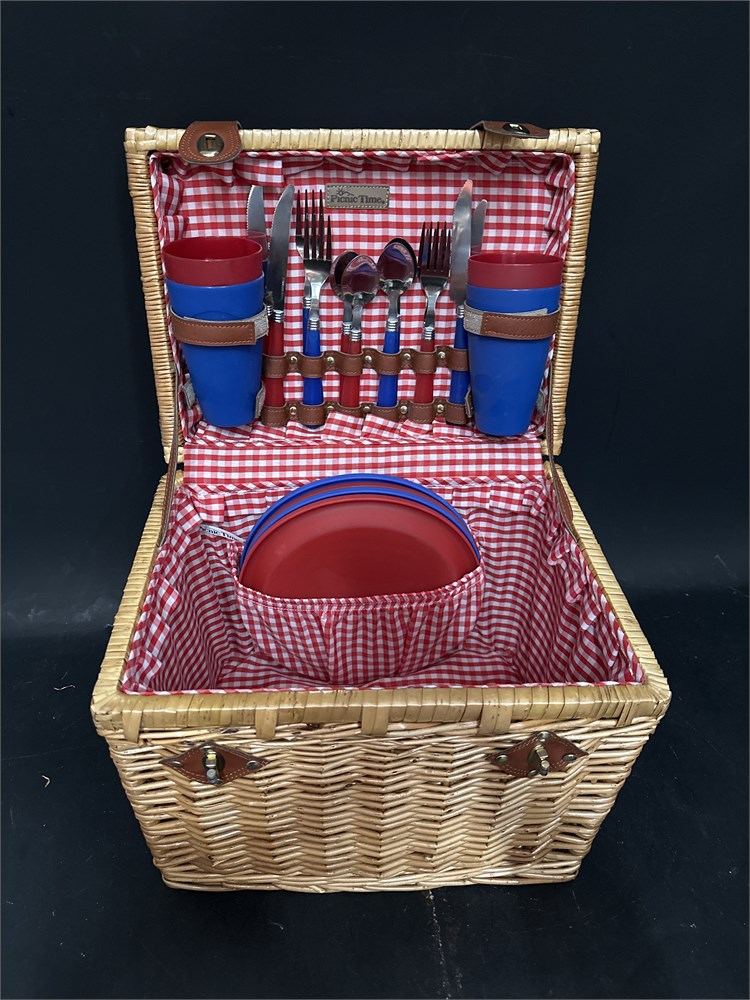 A Picnic Time classic wicker picnic basket set for two, featuring a red gingham interior lining. The set includes two red plates, two blue cups with brown holders, and two sets of flatware. The flatware has red handles. The basket is made of hand-woven wicker with a dual-entry lid. Faux leather straps secure the components and the lid. 13" H x 15" W x 11" D Good condition.