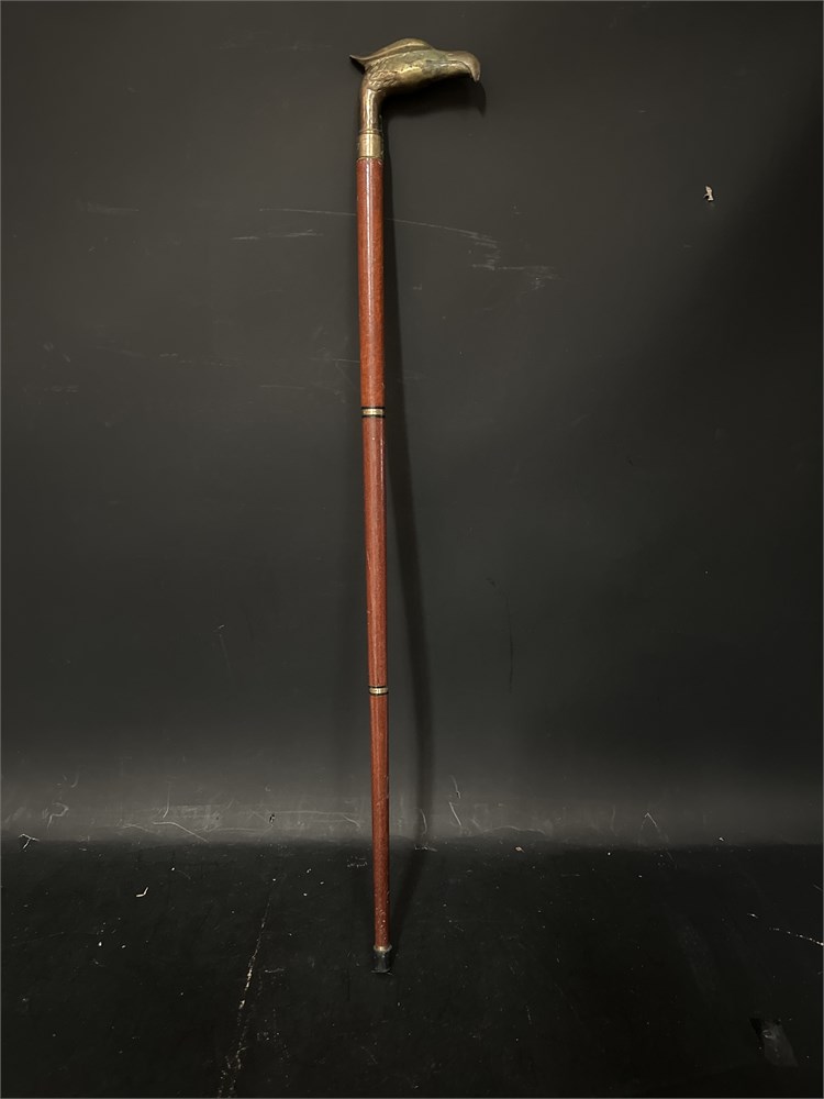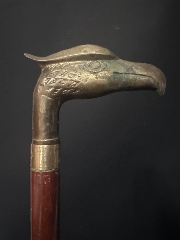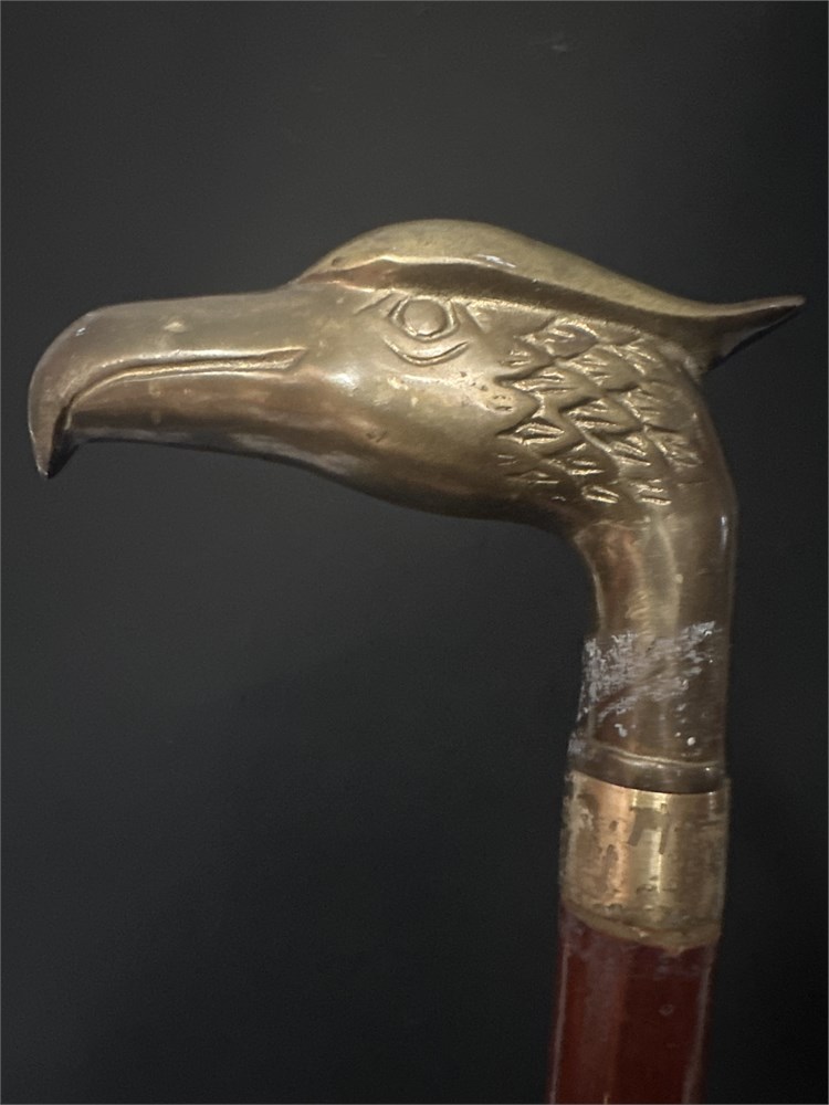 A vintage-style wooden walking stick with a solid brass eagle-head handle. The shaft is made from quality wood with an antique finish. It is a reproduction piece with a Victorian look. It may be used for mobility, display, or as a costume accessory. 35" L Good condition.